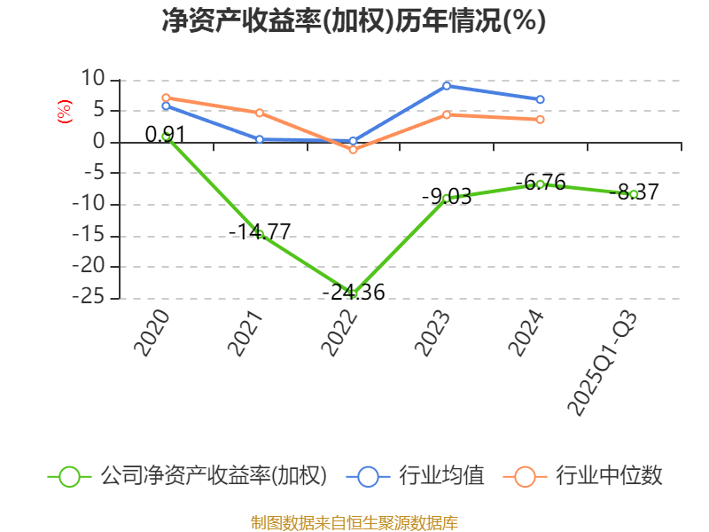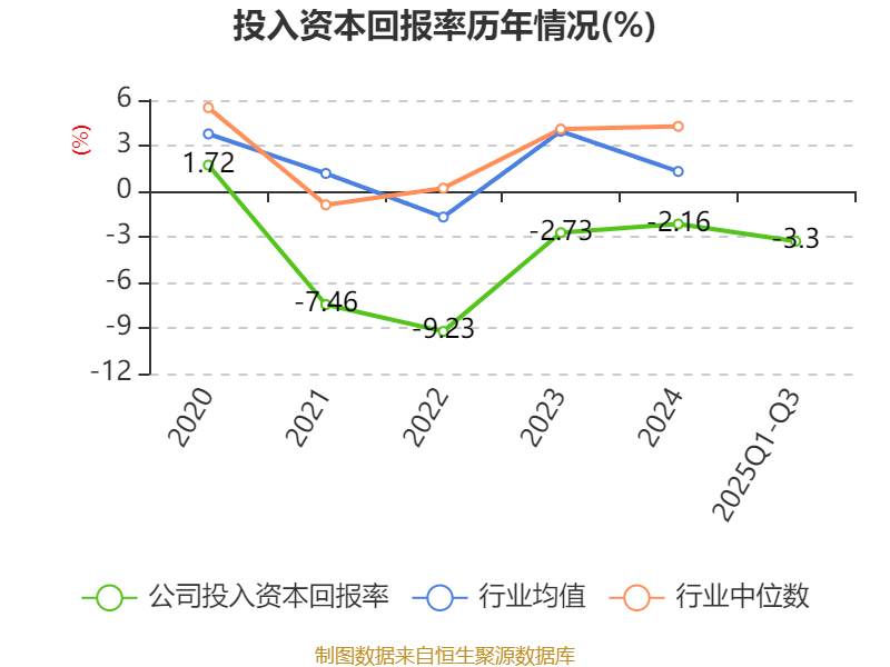 盈利能力方面, 2025年前三季度公司加权平均净资产收益率为-8.37%,同比下降2.77个百分点。公司2025年前三季度投入资本回报率为-3.3%,较上年同期下降1.37个百分点。