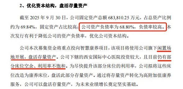 然而,这不仅仅是一次主动的战略出击,更像是一次被动的“去库存”行动。在定增预案的深处,公司坦诚地揭示了项目的实施背景:该项目将利用公司旗下的闲置场地开展,其核心目的之一是为了“盘活存量资产”。更关键的信息是,公司承认目前旗下医院“仍有部分床位空余、利用率不饱和”。