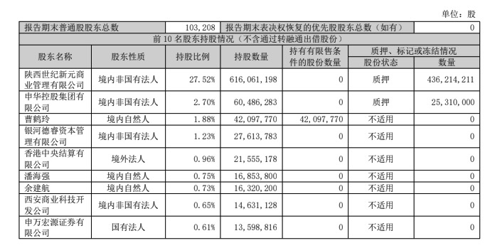 除了上市公司,《财中社》还注意到,公司实控人刘建申背后的资金压力同样不容忽视。根据公司最新的三季报及相关公告数据,公司控股股东——陕西世纪新元商业管理有限公司(下称“世纪新元”)的质押比例居高不下。截至三季度末,世纪新元持有公司约6.16亿股,其中处于质押状态的股份高达4.36亿股,质押率超过70%;其一致行动人申华控股的质押比例也超过40%。