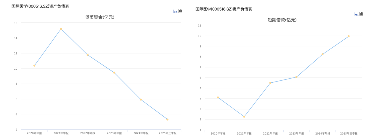 《财中社》注意到,近五年来国际医学的货币资金呈持续下降态势,而短期借款则整体攀升,两者走势形成鲜明对比。截至2025年9月30日,国际医学账面上的货币资金仅剩3.31亿元。然而,债务压力却不容小觑:公司的短期借款高达9.95亿元,加上一年内到期的非流动负债9.05亿元,一年内需要偿还的刚性债务总额接近19亿元。3亿现金对阵19亿短债,资金链的紧绷程度可见一斑。