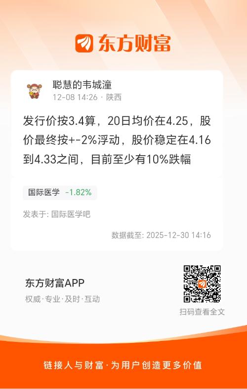 发行价按3.4算,20日均价在4.25,股价最终按+-2%浮动,股价稳定在4.16到4.33之间,目前至少有10%跌幅