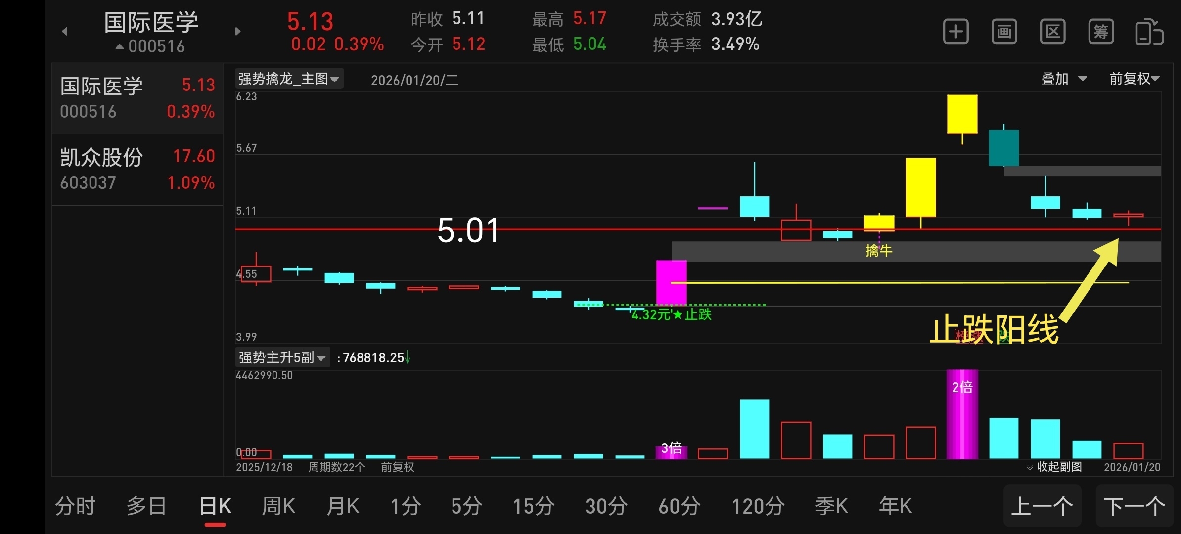 $国际医学(SZ000516)$ 今日国际如期收出止跌小阳线,发出买入信号,后期站在5.01关键位之上持股不动,跌破5.01短期走弱及时止损,不参与长时间的调整,这是短线操作,中线可以采取逐步买入摊低成本法进行潜伏持有,股价会随着公司基本面的逐步好转也会得到体现,个人是纯短线操作不做中线,发贴只是记录个人投资历程,不构成操作建议,风险自担!