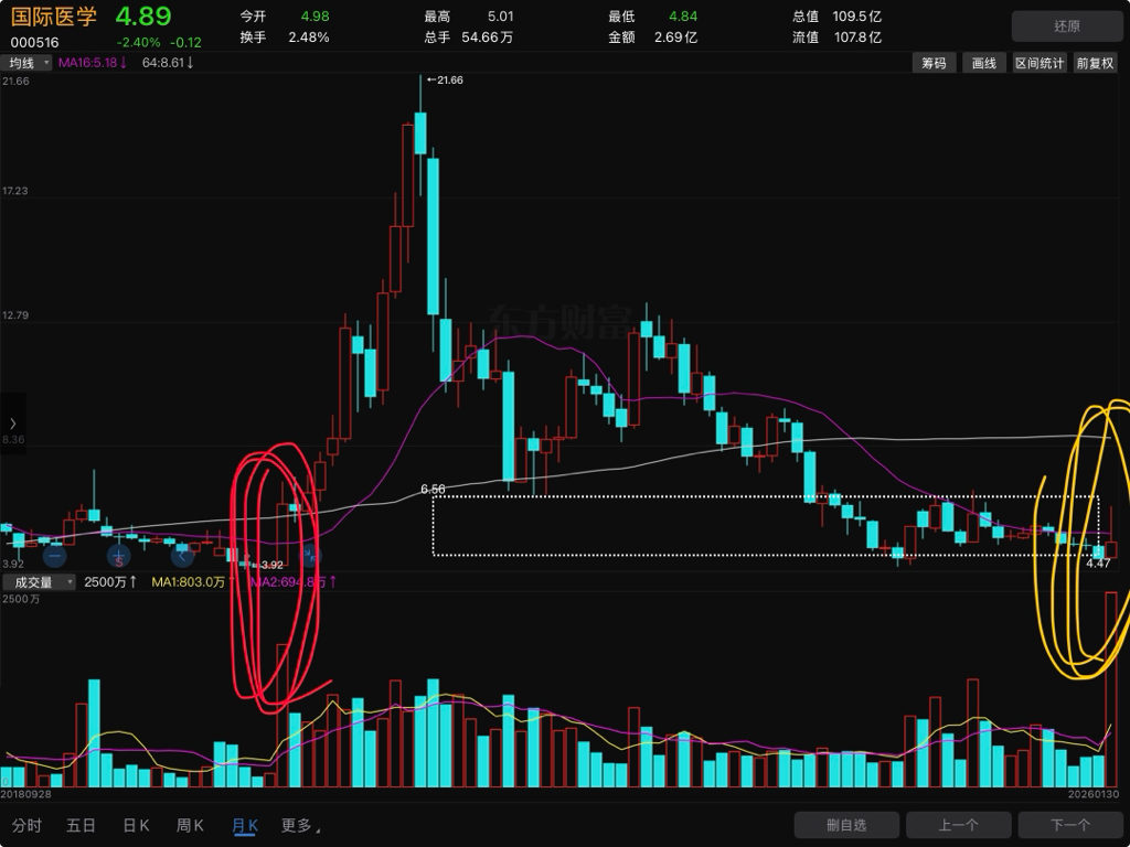 $国际医学(SZ000516)$ 看月线。