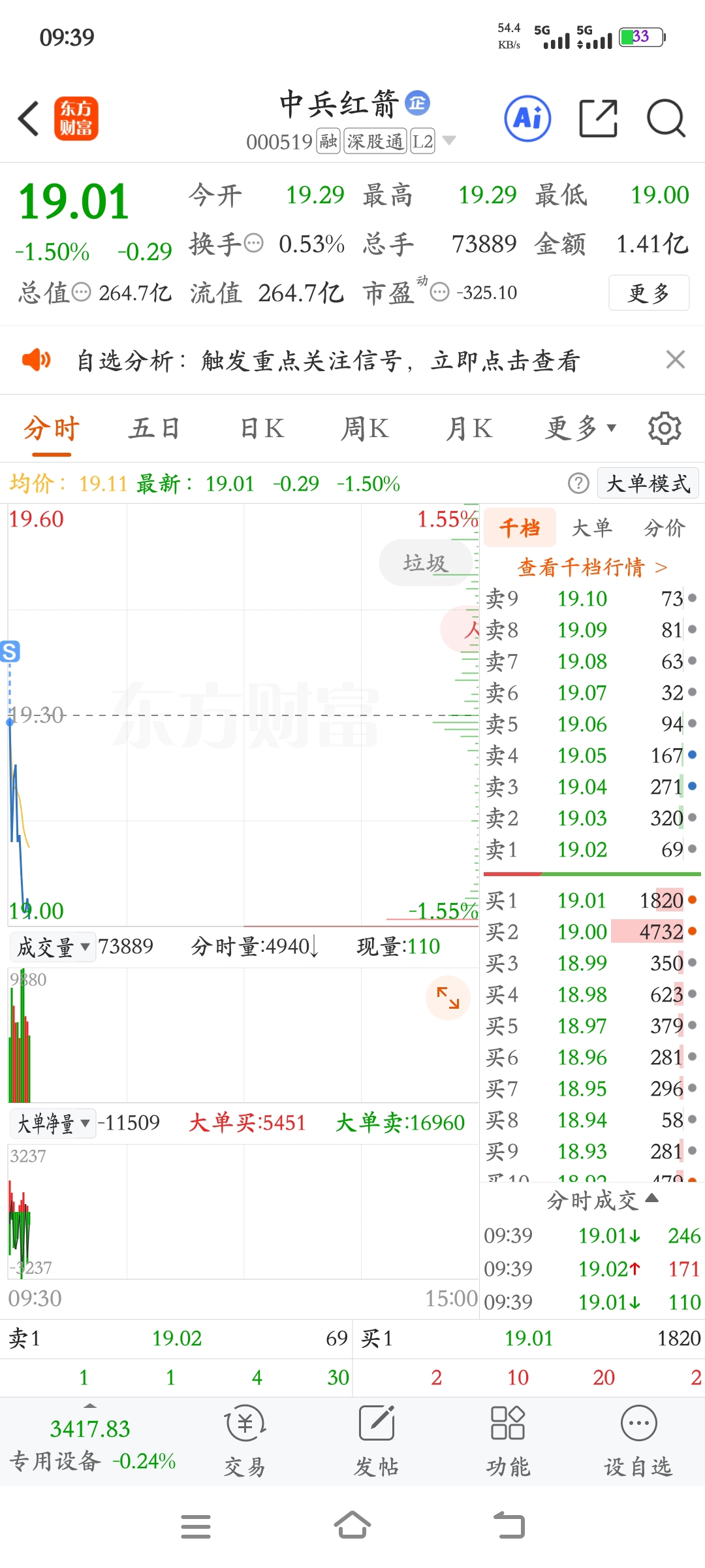 $中兵红箭(SZ000519)$ 当断不断,必受其乱。昨天主力就出逃了,转弱了