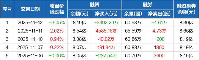 中兵红箭:融资净偿还3492.29万元,融资余额8.19亿元(11-12)