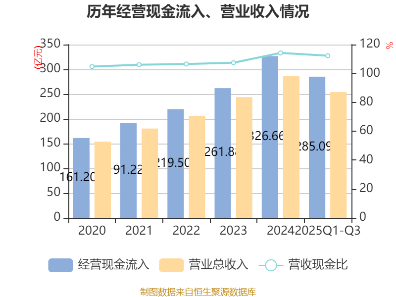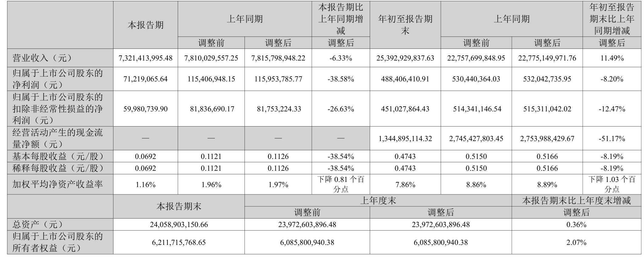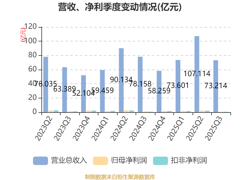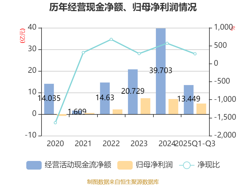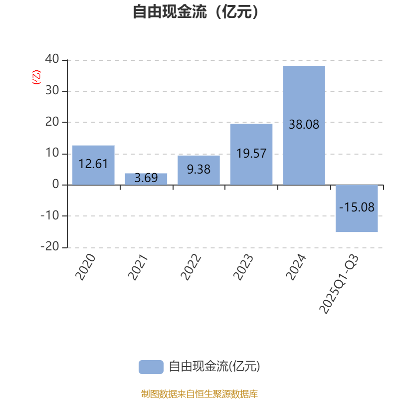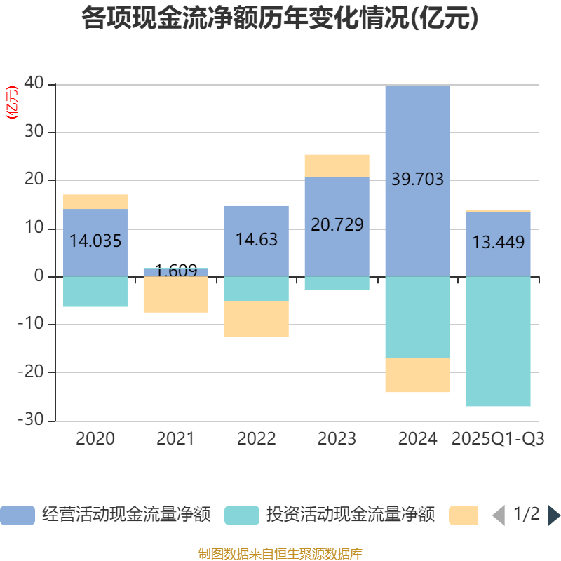 2025年前三季度,公司经营活动现金流净额为13.45亿元,同比下降51.17%;筹资活动现金流净额4462.73万元,同比增加5.65亿元;投资活动现金流净额-26.99亿元,上年同期为-24.86亿元。