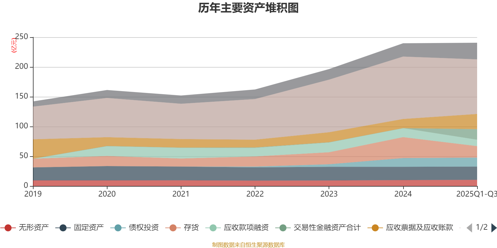 资产重大变化方面,截至2025年三季度末,公司交易性金融资产合计占公司总资产的7.38%,上年末为0;存货较上年末减少45.27%,占公司总资产比重下降6.67个百分点;货币资金较上年末减少12.45%,占公司总资产比重下降5.59个百分点;应收票据及应收账款较上年末增加66.56%,占公司总资产比重上升4.2个百分点。