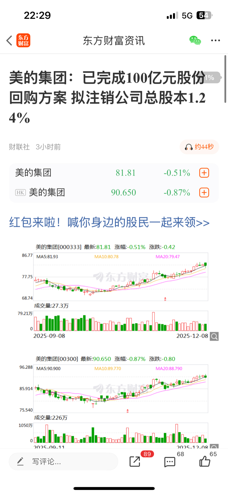 看看美的在你后面发布回购50-100亿的已经回购完成。而且注销了。垃圾啊