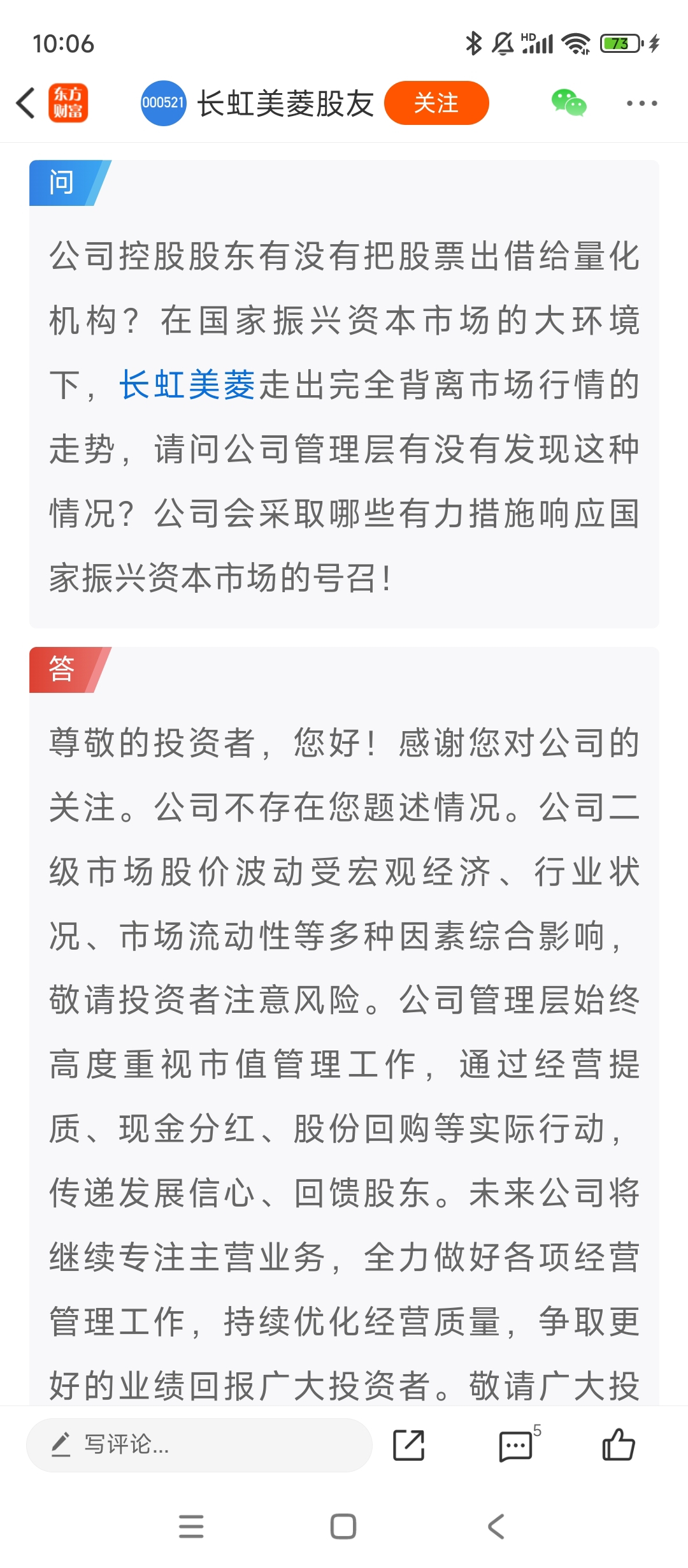 $长虹美菱(SZ000521)$ 有股民问: 公司控股股东有没有把股票借给量化机构?
