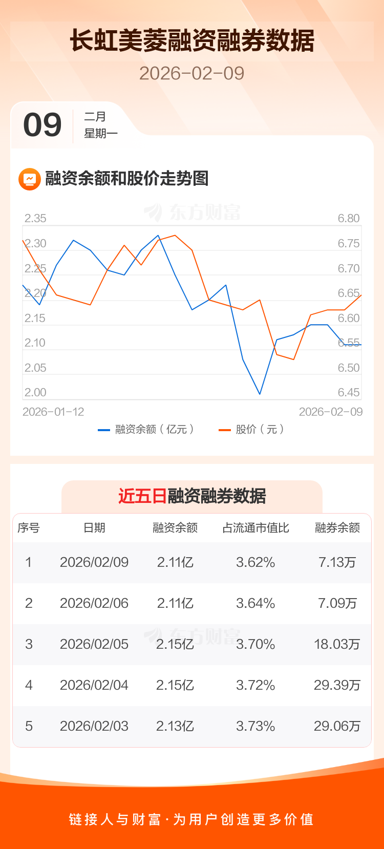 交易所最新数据显示,长虹美菱于2026年2月9日获融资买入732.46万元,融资偿还772.15万元,当日融资净偿还39.69万元。目前,该股融资余额2.11亿,占流通市值比例为3.62%。