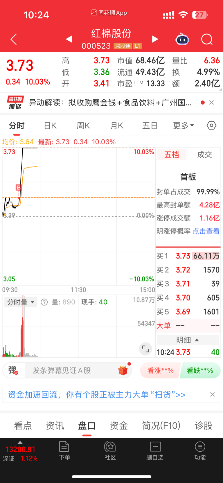 $红棉股份(SZ000523)$ 红棉是被我分入强势基因股票分列的,周五看着形态不错就买入了,买入后不到1分钟就拉涨停了,非常感谢这个股基因很强,跟风范-顺灏-五洲这些票一样,很强的.