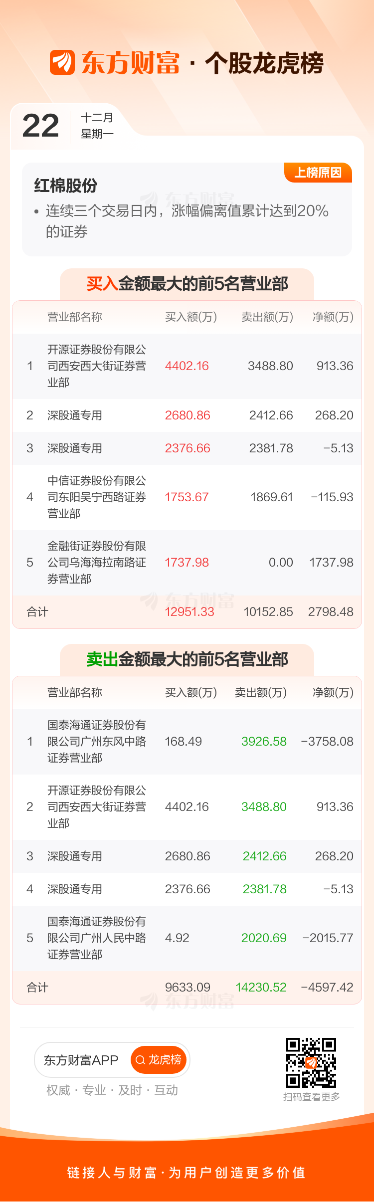 交易所2025年12月22日公布的交易公开信息显示,红棉股份因成为连续三个交易日内,涨幅偏离值累计达到20%的证券上榜。红棉股份当日收报4.1元,涨跌幅9.92%,换手率10.70%,成交额5.72亿。异常期间12月18日至12月22日,期间涨幅23.12%,累计偏离值21.72%,区间成交额10.51亿。