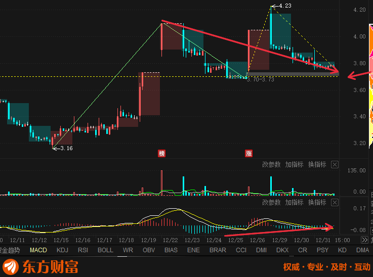 补缺口反弹 还是选择向下洗盘, 黄金分割位3.57 看小周期有回补缺口的迹象 已经跌破第一黄金分割位置 假如缺口补了起不来就凉了 MACD量能住在减弱空头力量减小是好事 但是月K线放量 应该进来很多韭菜 还是有洗盘的要求 真不好说呀 随缘把 不重仓就好办 希望节后来个红包