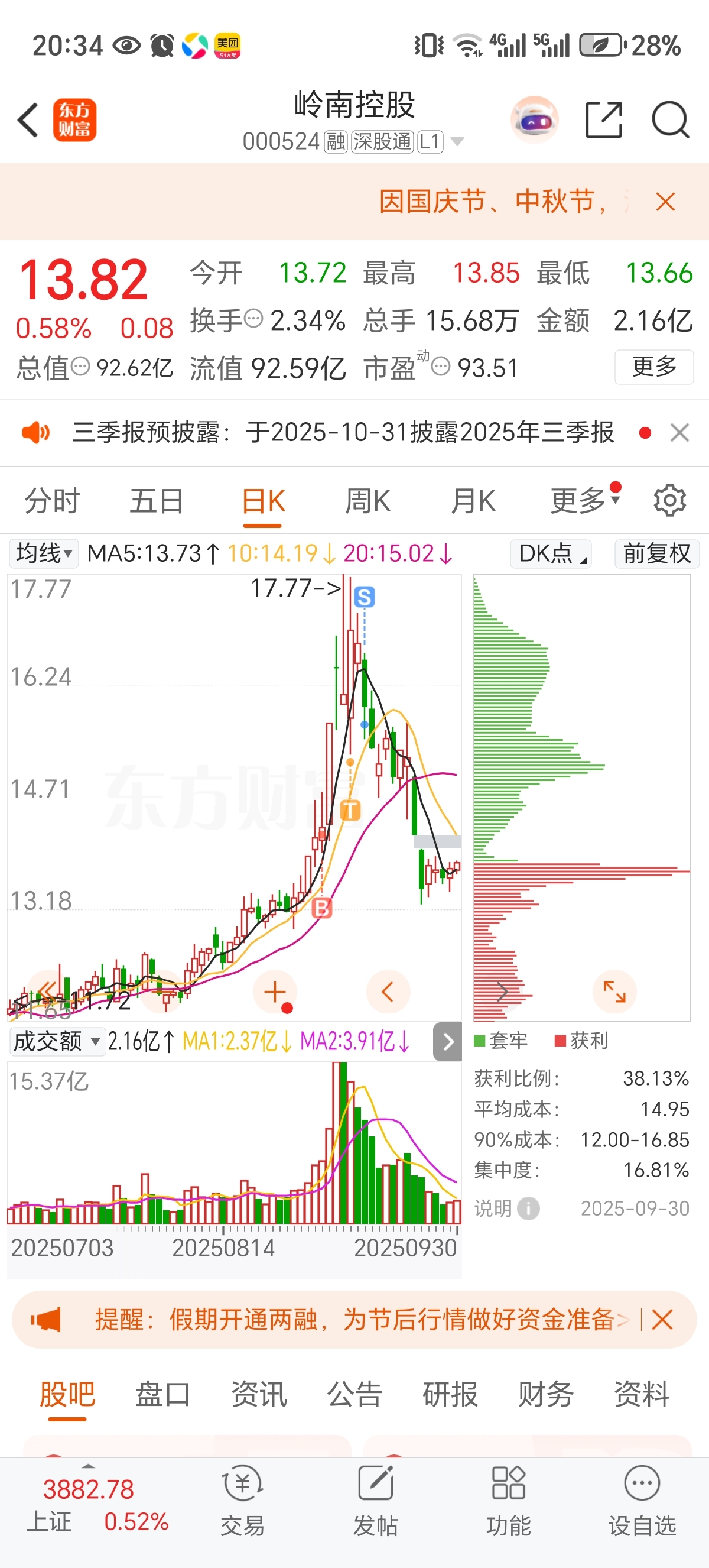 $岭南控股(SZ000524)$ 八月九月不管是半仓还是全仓在北方跟岭南的操作,如果你现在问我在哪个股,在tcxc,kljd,本人看好好几个股,大智慧不错,北摩高科是我非常喜欢的,很早就关注了,一直没看到止跌位置不敢贸然入,谁知道涨停了,航天飞机跟军工的绝佳靓题材,fhgk跟jtdj不错都有量也很强的想要向上趋势,可惜我资金不多,不能抓那么多个,龙鱼潜浅水,无可施展