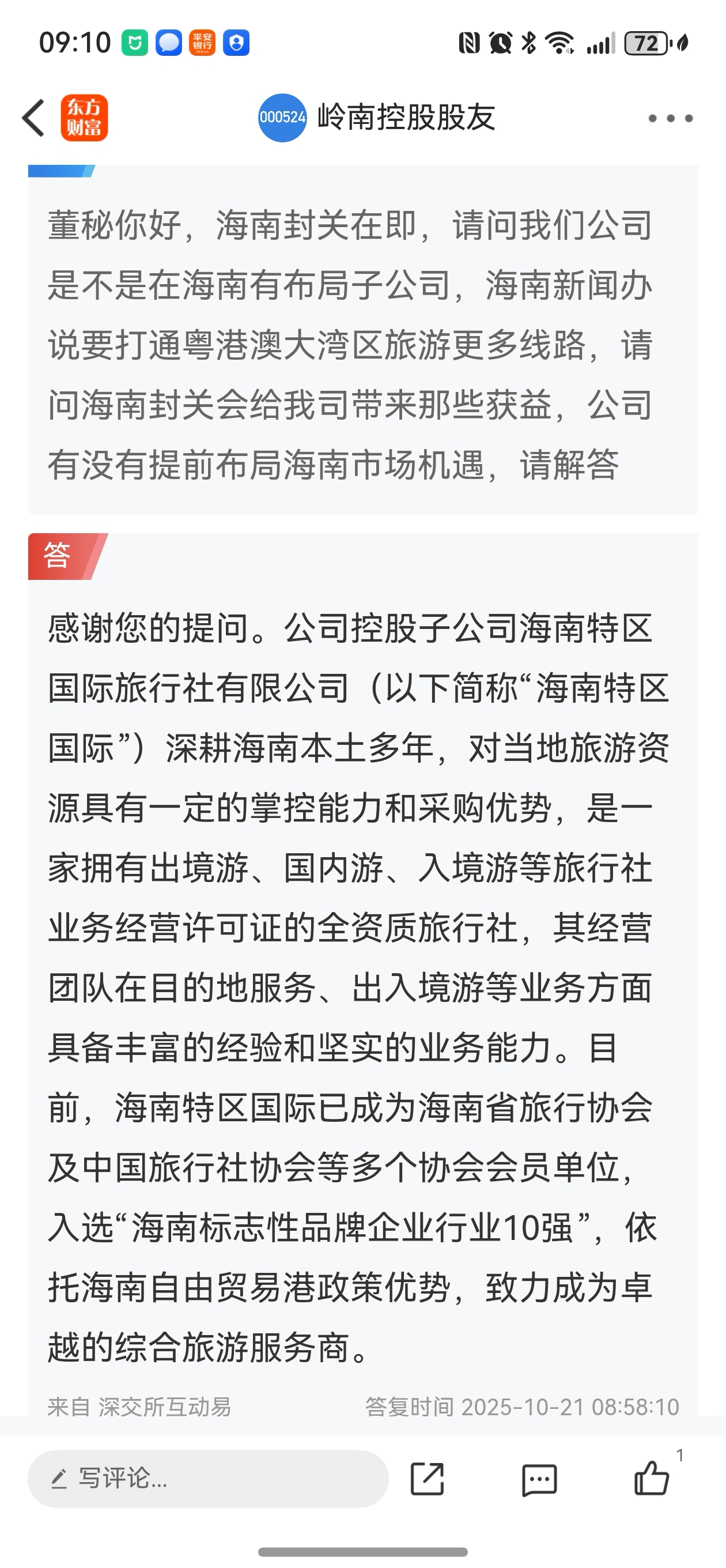 $岭南控股(SZ000524)$ 董秘回复公司在海南有子公司,也是海南封关自贸的参与者,要求添加海南自贸概念 各位股友去维护一下概念,避免要找海南票的股友找不到岭南,凯撒不是唯一布局海南的