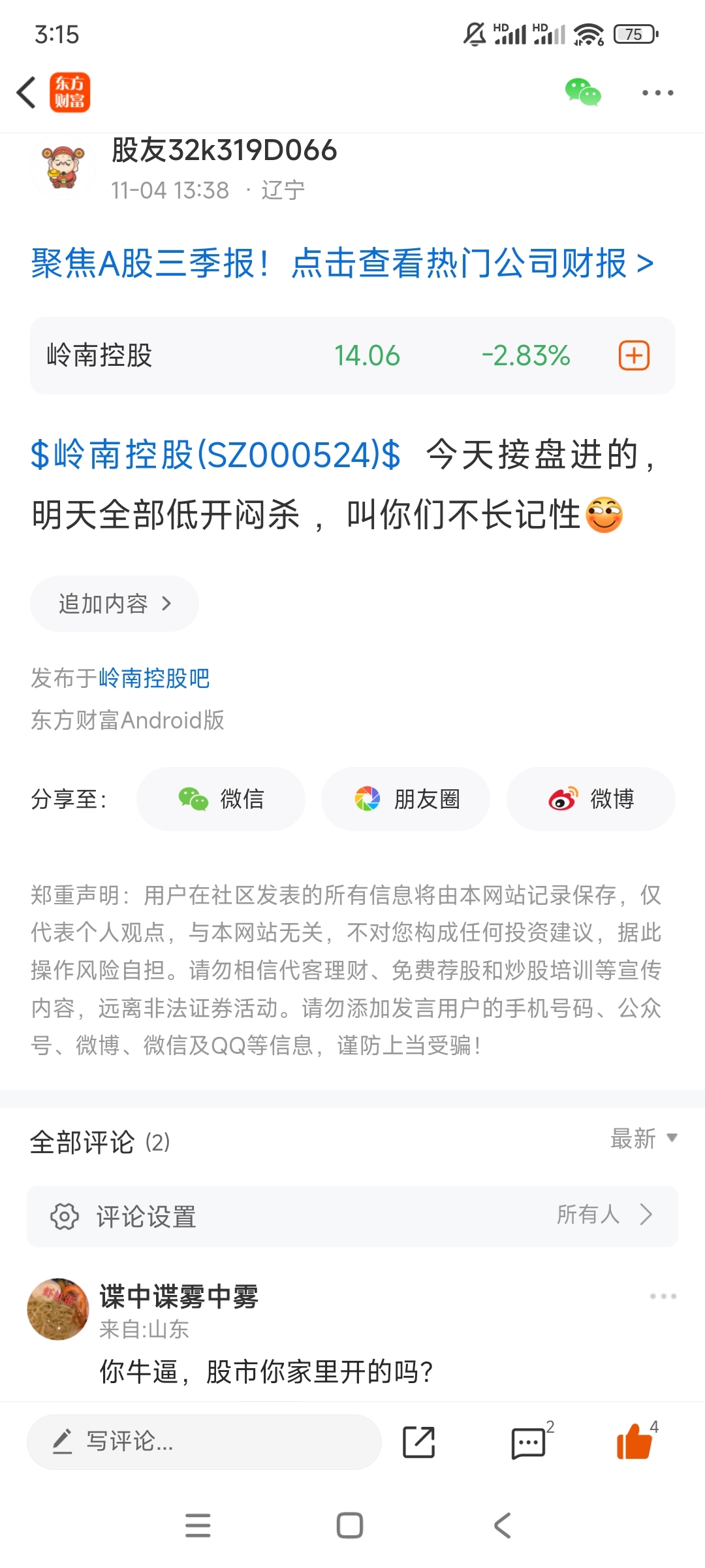 $岭南控股(SZ000524)$ 一群人天天在唱多全运会,庄家正好趁利好全部把货出给你,明牌的利好还是利好吗,有的人还自认聪明自己给自己找利好,天天在股吧发,今天抄底的明天继续闷杀,这庄家专治头铁的,不信明天走着瞧,继续大跌