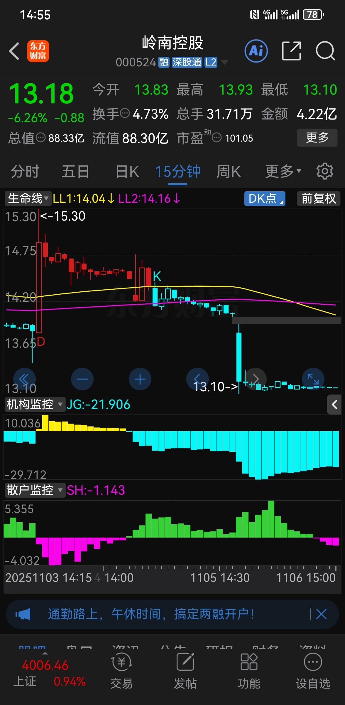 $岭南控股(SZ000524)$ 看见没有蓝色柱子代表主力今天一直出货,根本没有买