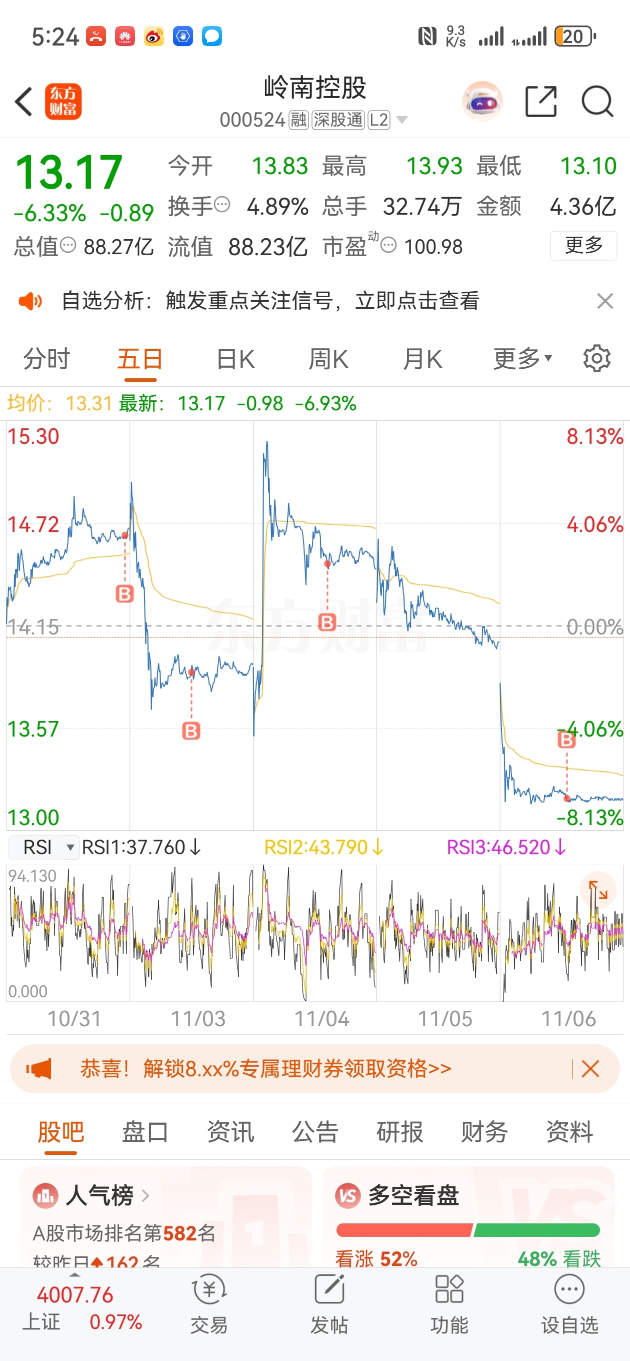 $岭南控股(SZ000524)$ 有本事你明天再跌,我还有三分之二仓位,慢慢陪你玩