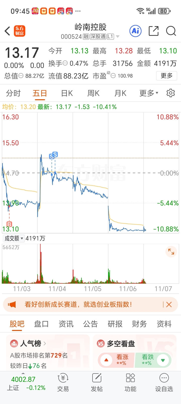 $岭南控股(SZ000524)$ 两天没动了,08先来一半.不知有没有机会。
