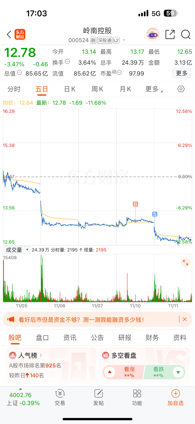 $岭南控股(SZ000524)$ 我昨天是脑子有泡才选了你,持仓几个小时我大几千块没了