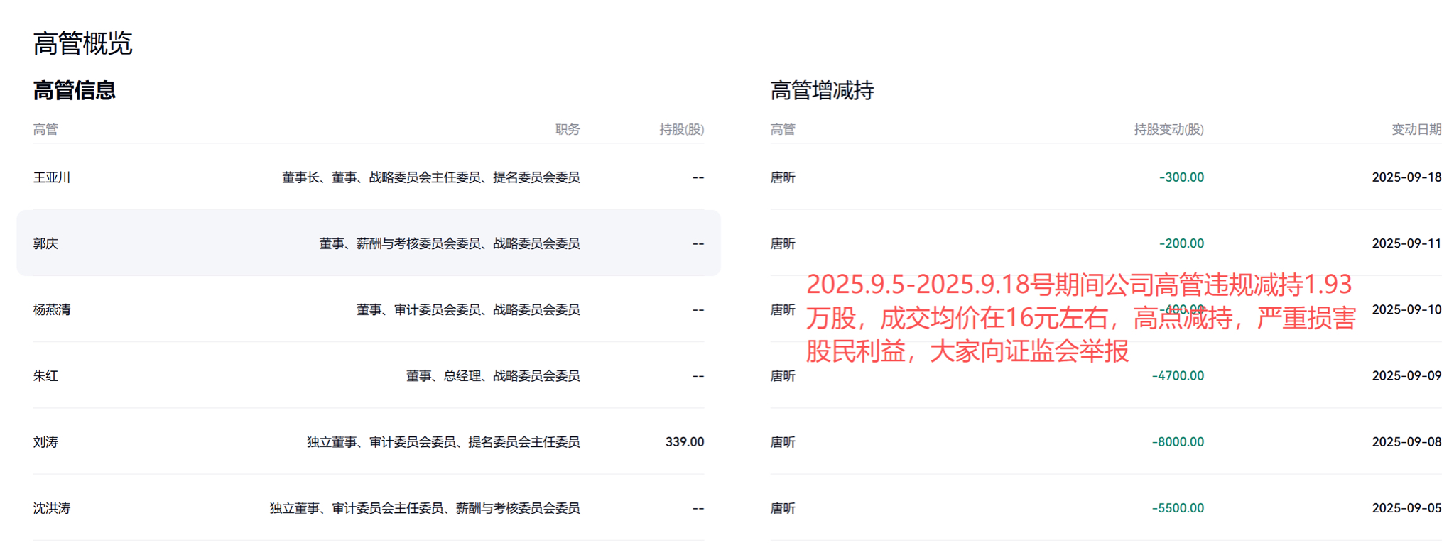 $岭南控股(SZ000524)$ #实盘记录# 2025.9.5-2025.9.18号期公司高管违规减持1.93万股,成交均价在16元左右,未提前发布公告,严重违规在高点减持,严重损害报股民利益,大家向证监会举报