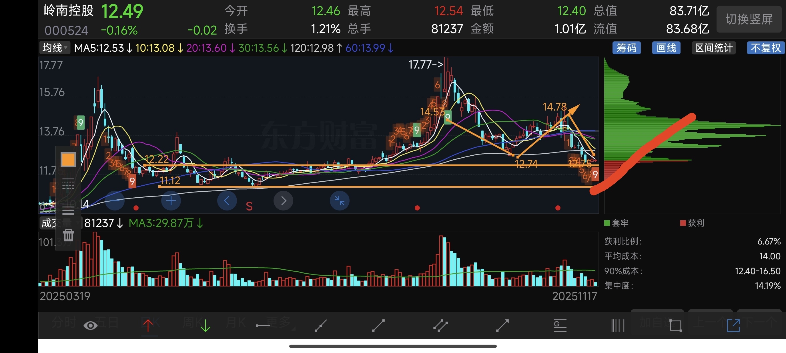 $岭南控股(SZ000524)$ 支撑位到了,接下来就看反弹,这一波反弹是下跌中的四浪还是上涨,还是新的上涨途中的一浪?不得而知。反弹高度看到13.5~13.8元,到这个价位,不管走什么浪,都要回调。