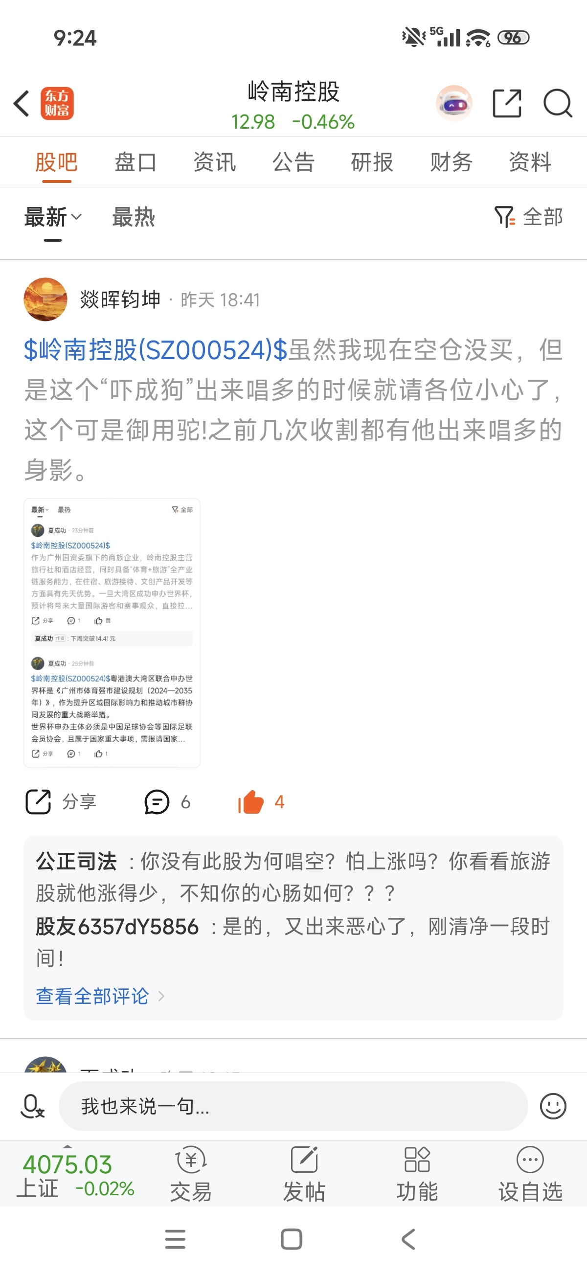 $岭南控股(SZ000524)$ @公正司法 出来走两步,没事走两步,到底咱俩谁不懂?我说那个叫吓成狗的是驼,你这会服不服?