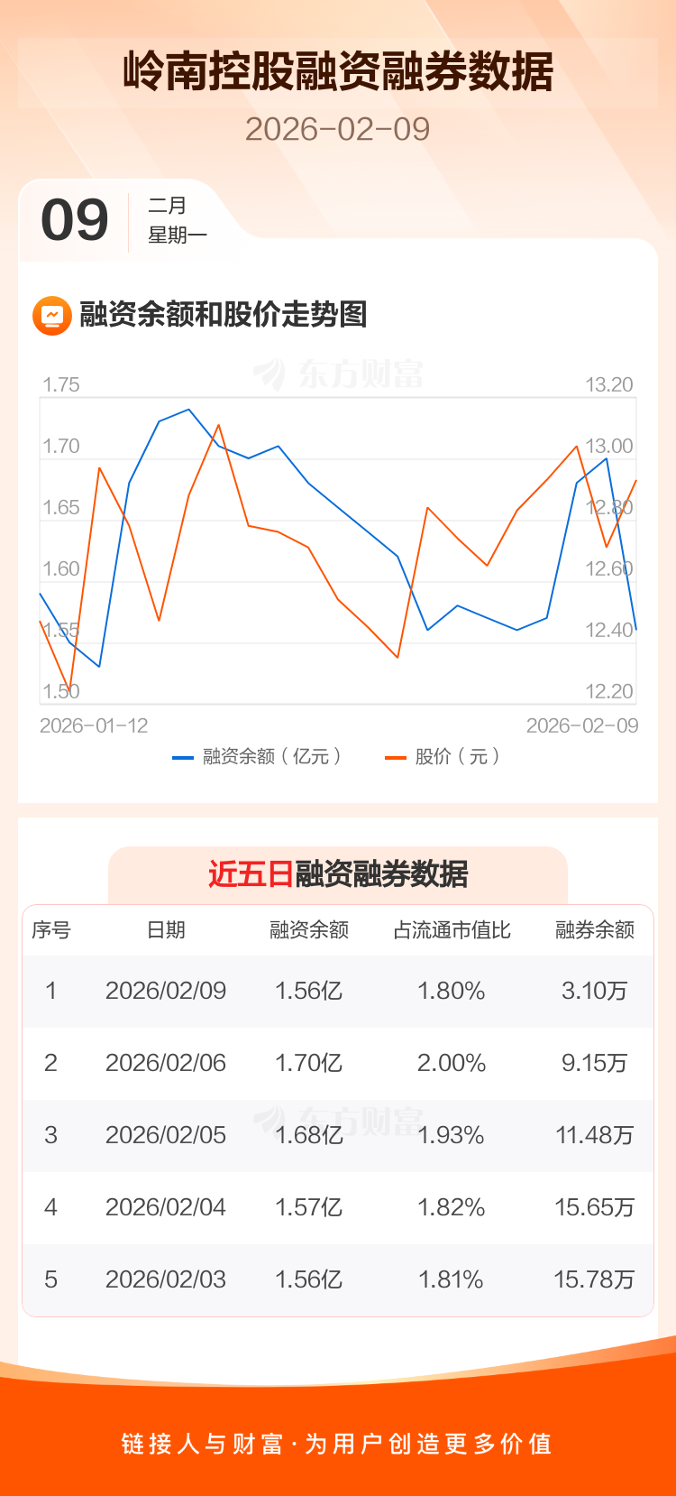 交易所最新数据显示,岭南控股于2026年2月9日获融资买入1337.05万元,融资偿还2707.15万元,当日融资净偿还1370.11万元。目前,该股融资余额1.56亿,占流通市值比例为1.80%。