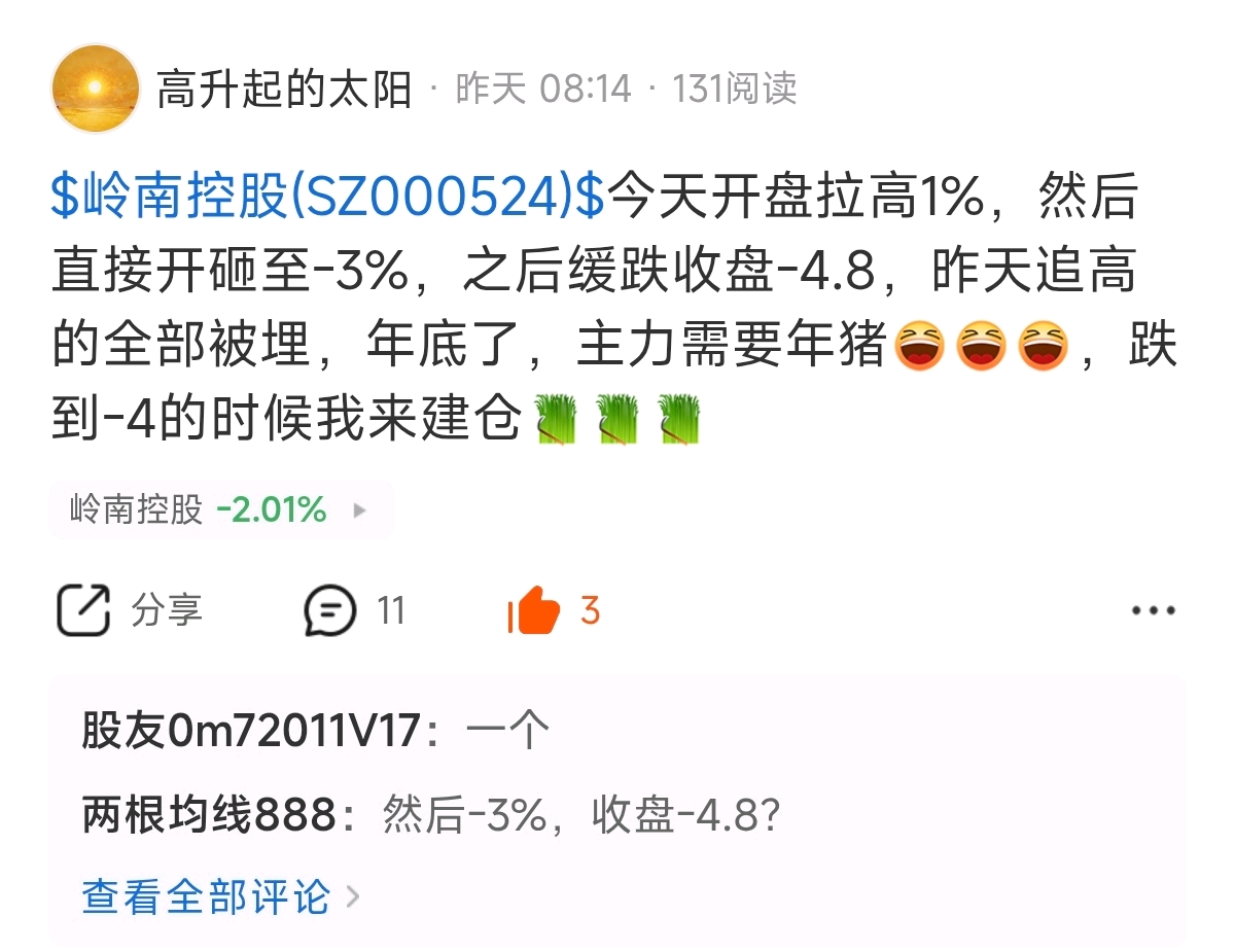 $岭南控股(SZ000524)$ 果然如我所料,看目前周四的话我有机会拿到更低筹码,今天尾盘先建仓2000股,家人们,我来啦