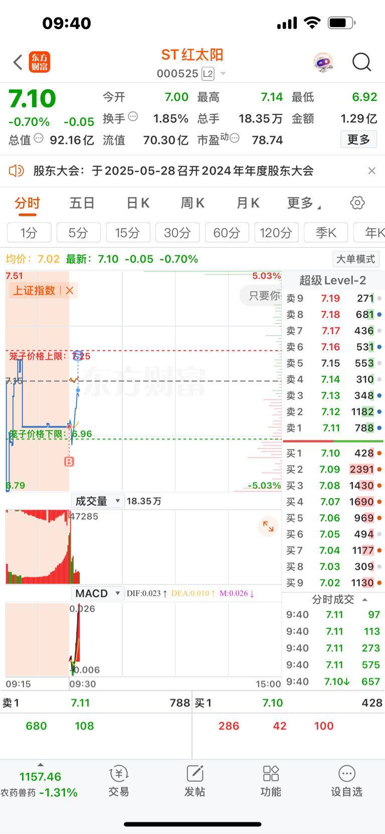 $ST红太阳(SZ000525)$ 集合竞价买回昨天减的半仓,拉高卖剩下的半仓成本降落5.6