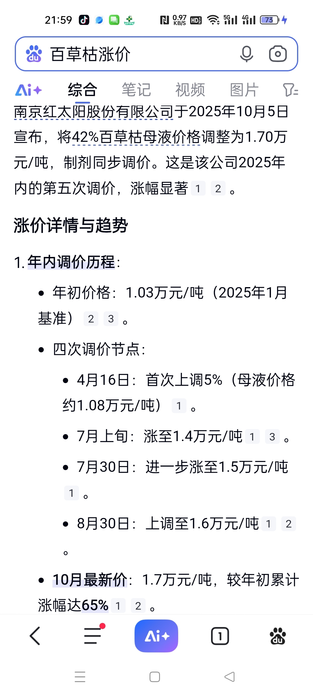 $红太阳(SZ000525)$ 2025年10月百草枯母液价格涨至1.7万元/吨