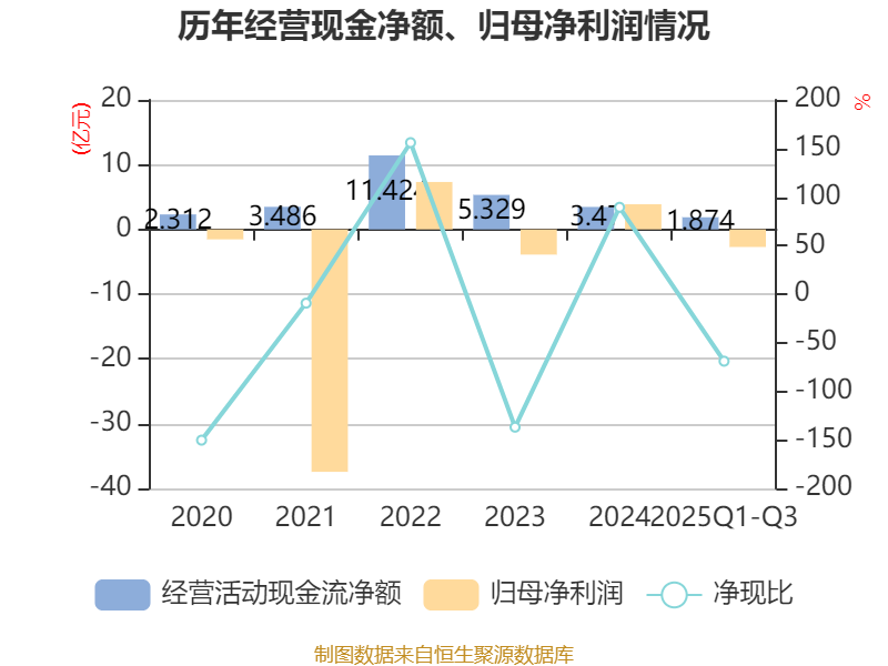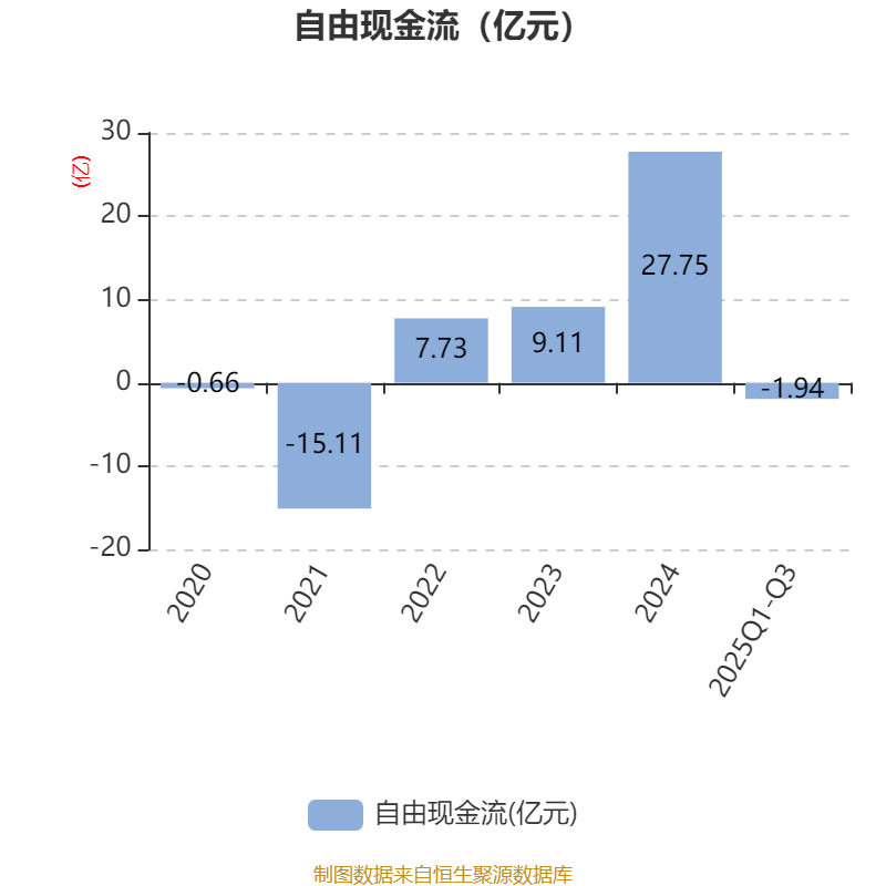 2025年前三季度,公司经营活动现金流净额为1.87亿元,同比下降26.5%;筹资活动现金流净额-4792.24万元,同比增加1.37亿元;投资活动现金流净额-1.57亿元,上年同期为-6115.88万元。