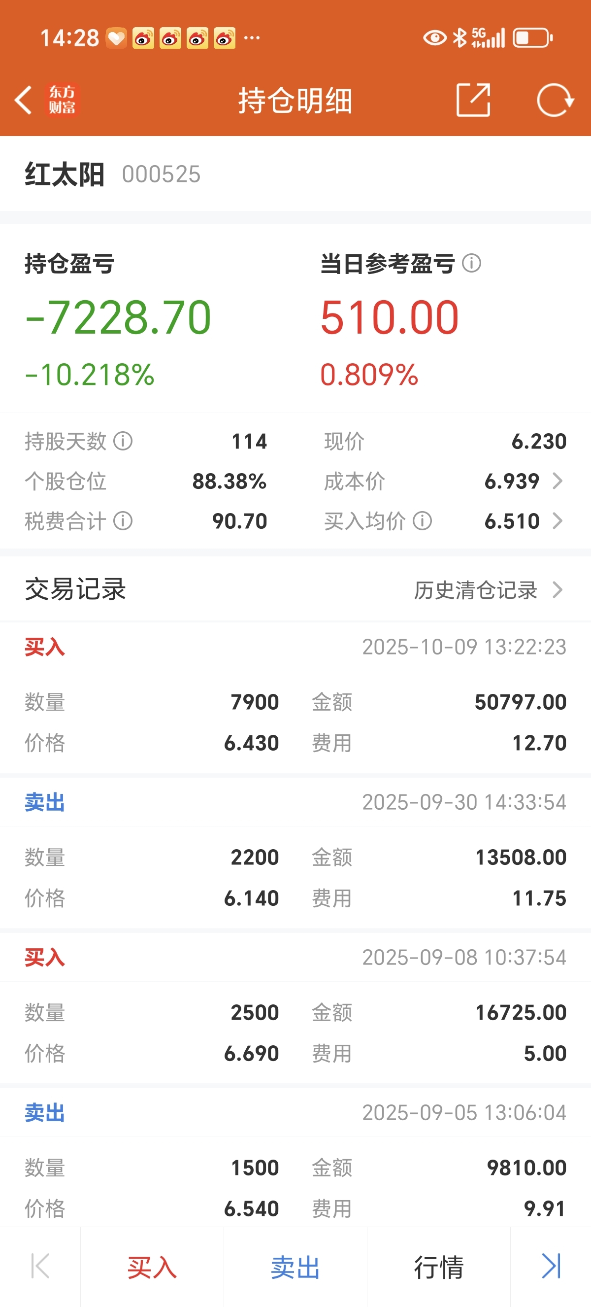 $红太阳(SZ000525)$ 家人们看看我能回本不