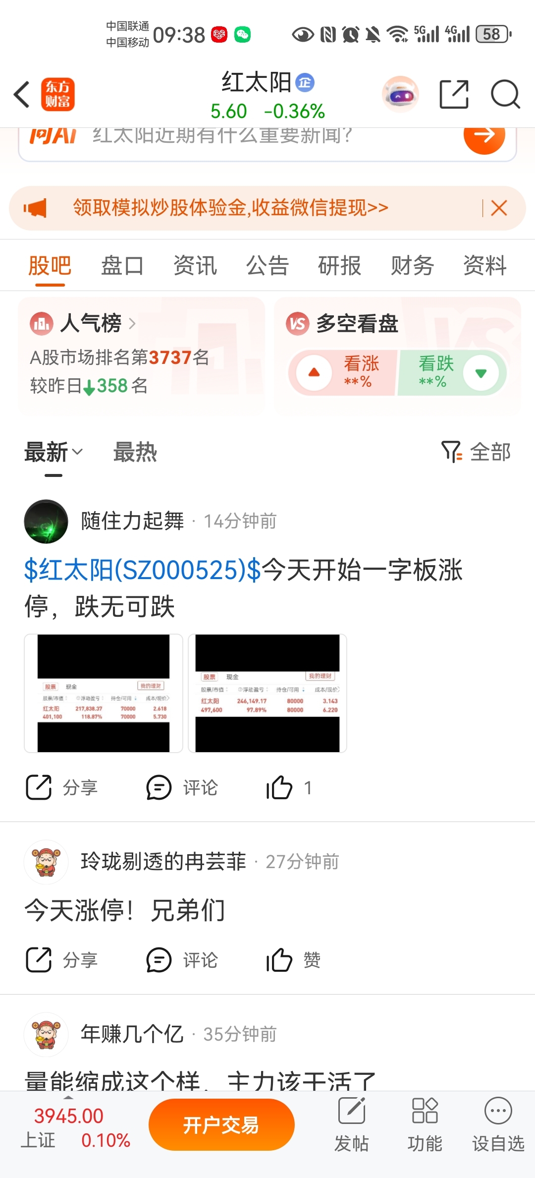 $红太阳(SZ000525)$ 快看有沙子儿,每天一张图涨停,下午就删帖,进来的擦亮眼睛别被忽悠进来。