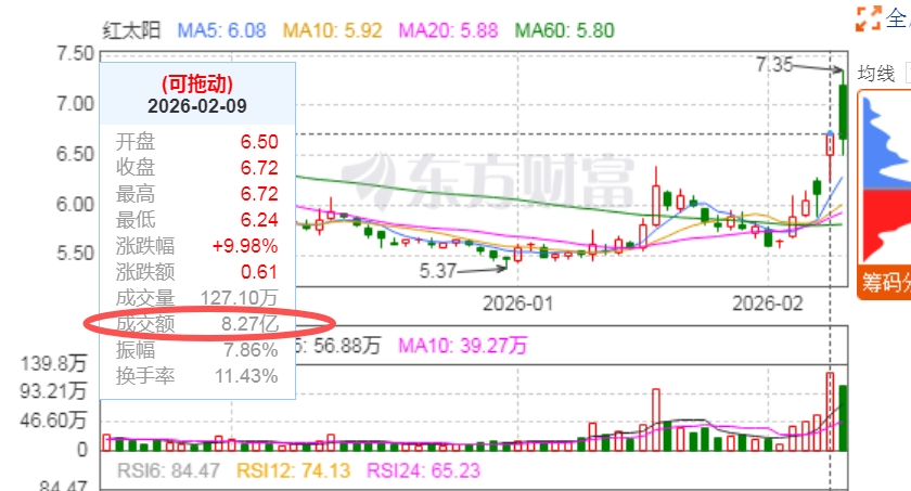 昨天全天交易额才8.27亿,尾盘就拉到了涨停。今天才一个半小时交易额就到了7.2
