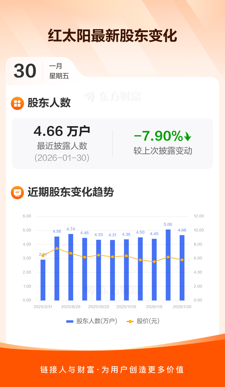 红太阳:截至1月30日最新股东户数4.66万户,较上期减少7.90%
