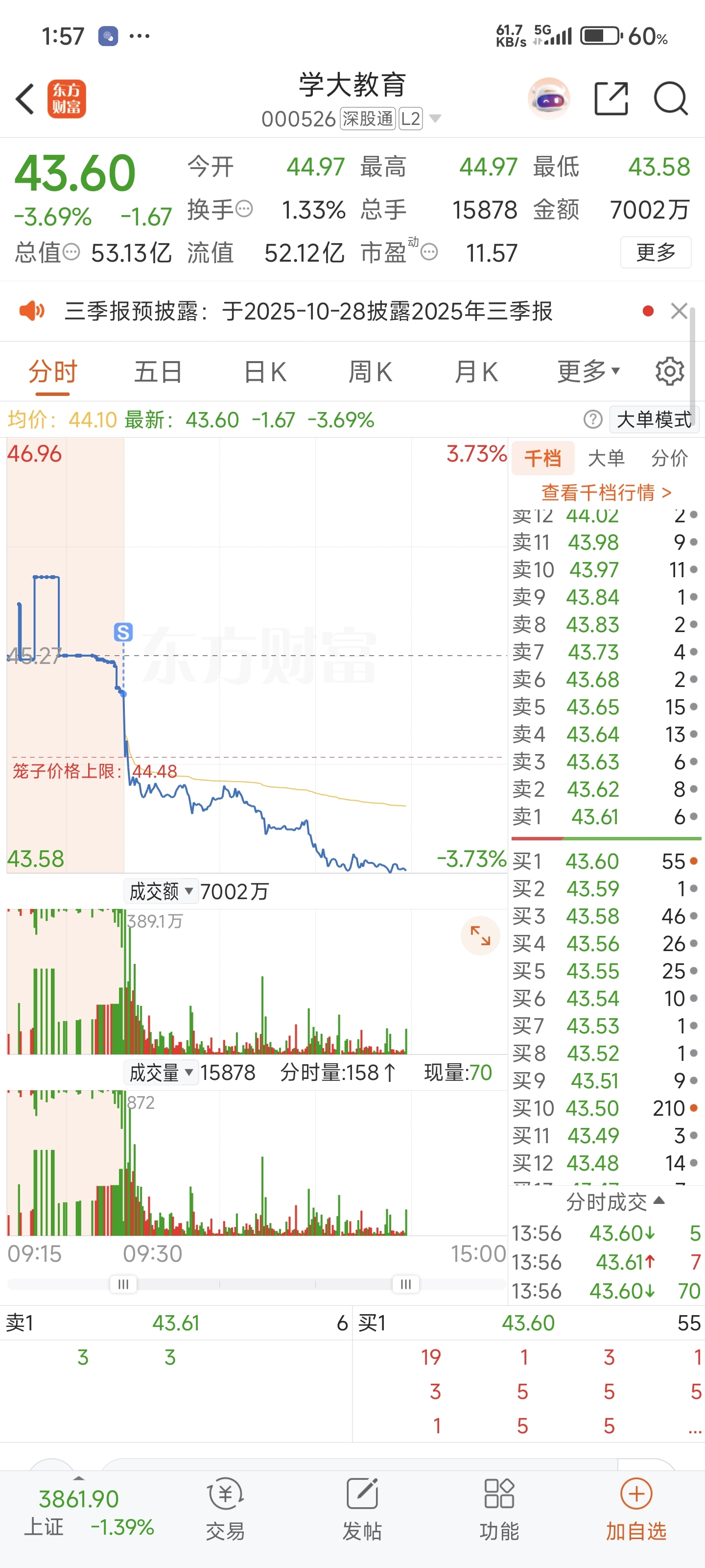 $学大教育(SZ000526)$ 昨天冲高回落一猜就是一日游,不是高开都不符合预期,必须竞价直接挂跌停砸盘