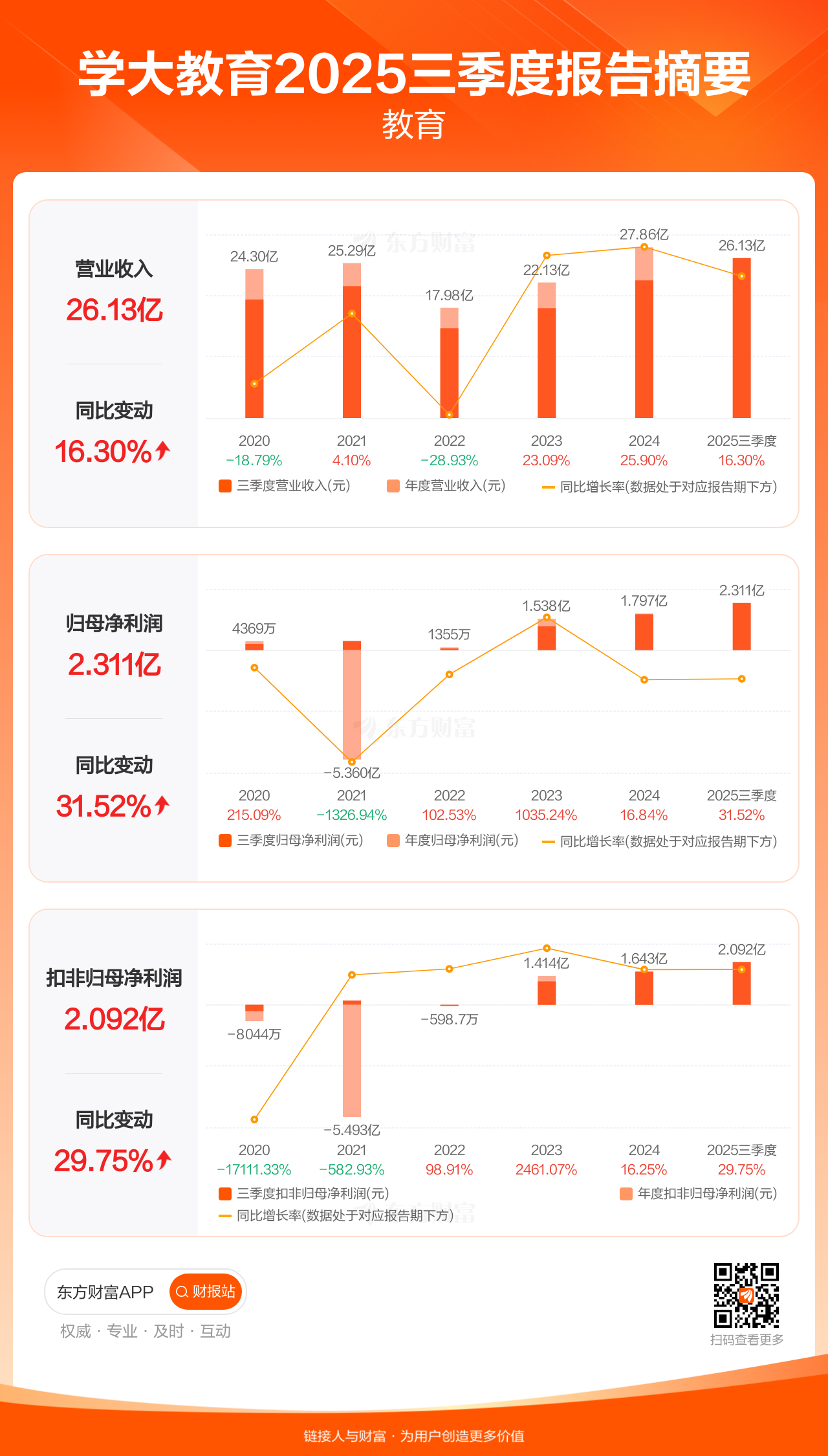 学大教育10月28日发布2025年三季报显示,公司前三季实现营业收入26.13亿元,同比增长16.30%;归母净利润2.31亿元,同比增长31.52%;扣非归母净利润2.09亿元,同比增长29.75%。
