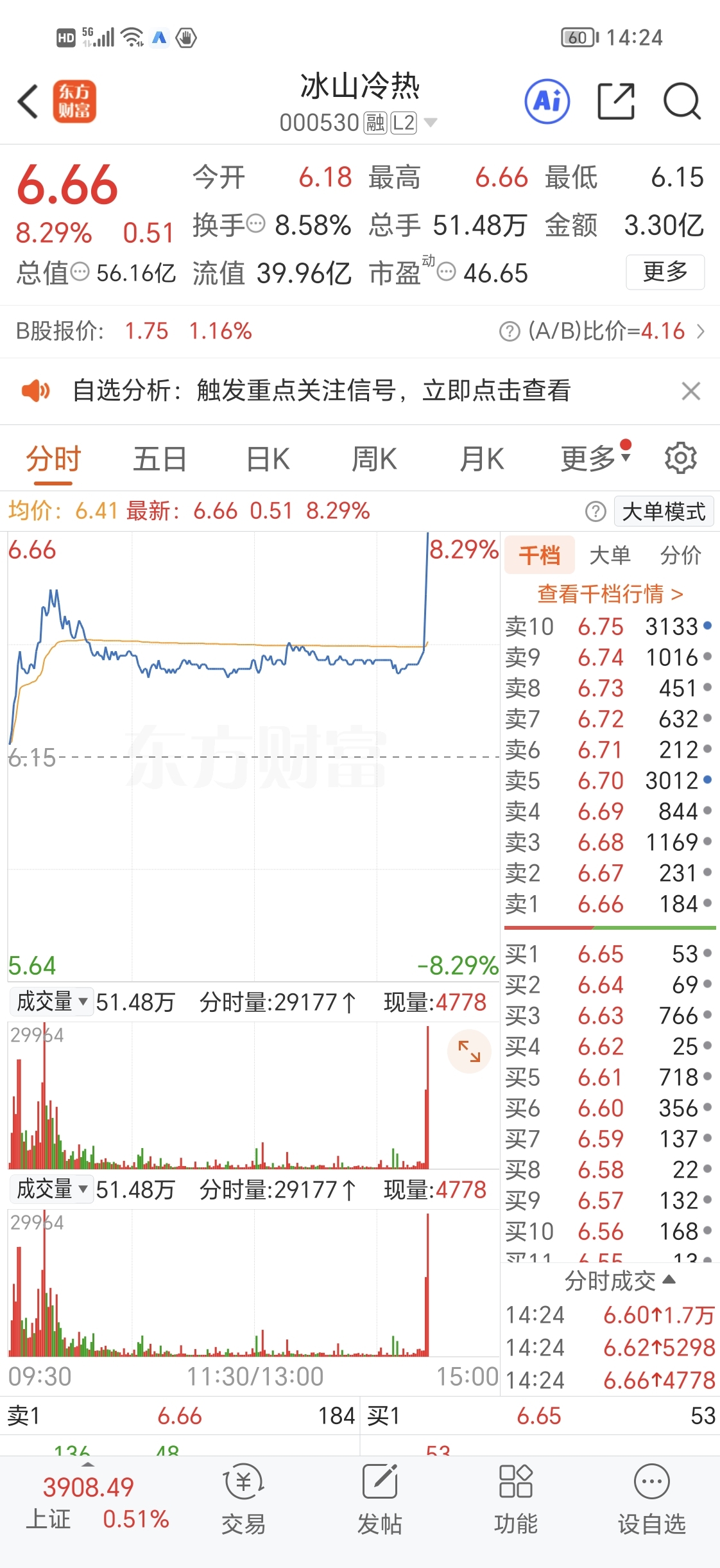 $冰山冷热(SZ000530)$ 最近一直看好冰雪,一直买一直不挣钱。今天早盘进了欧亚。刚才冰山一冲就知道机会来了,可惜没仓位了。哎