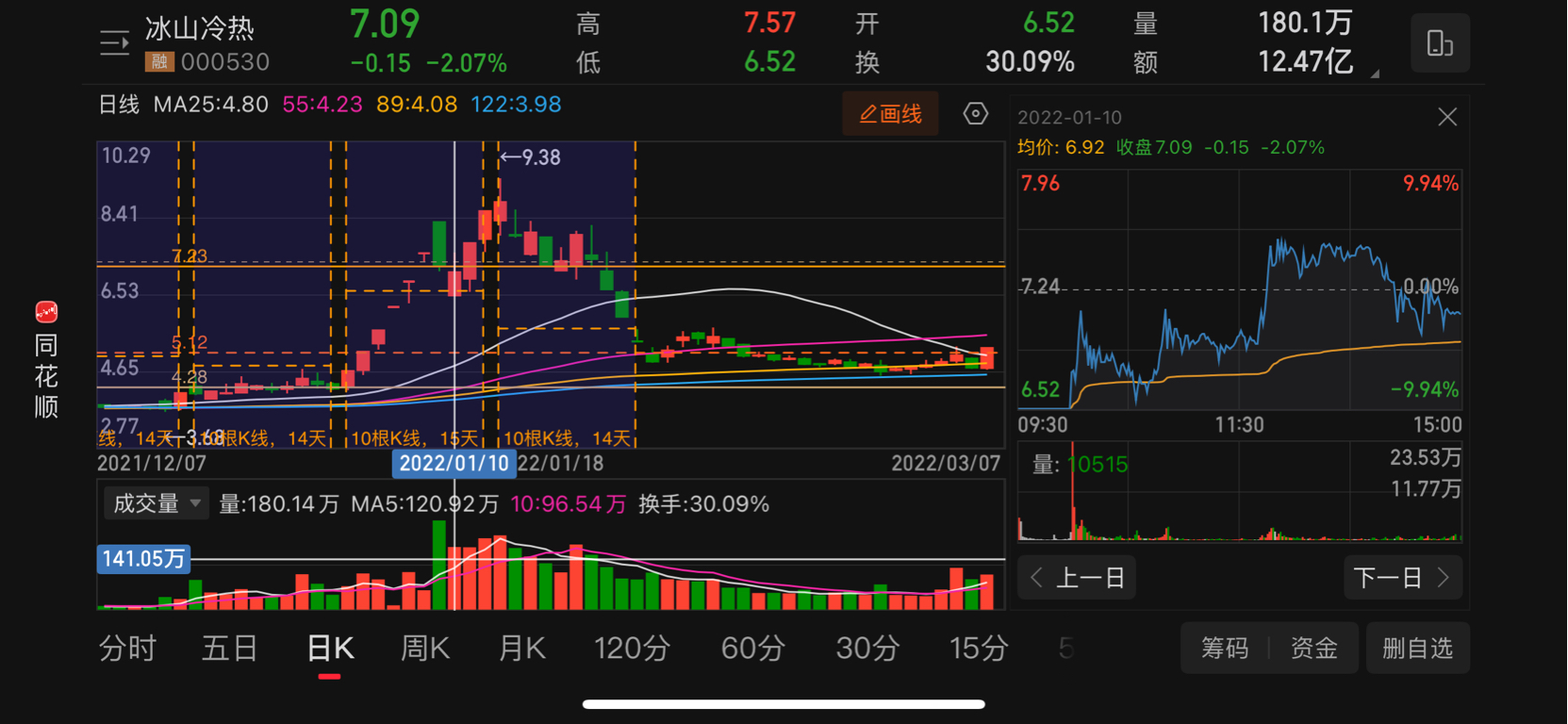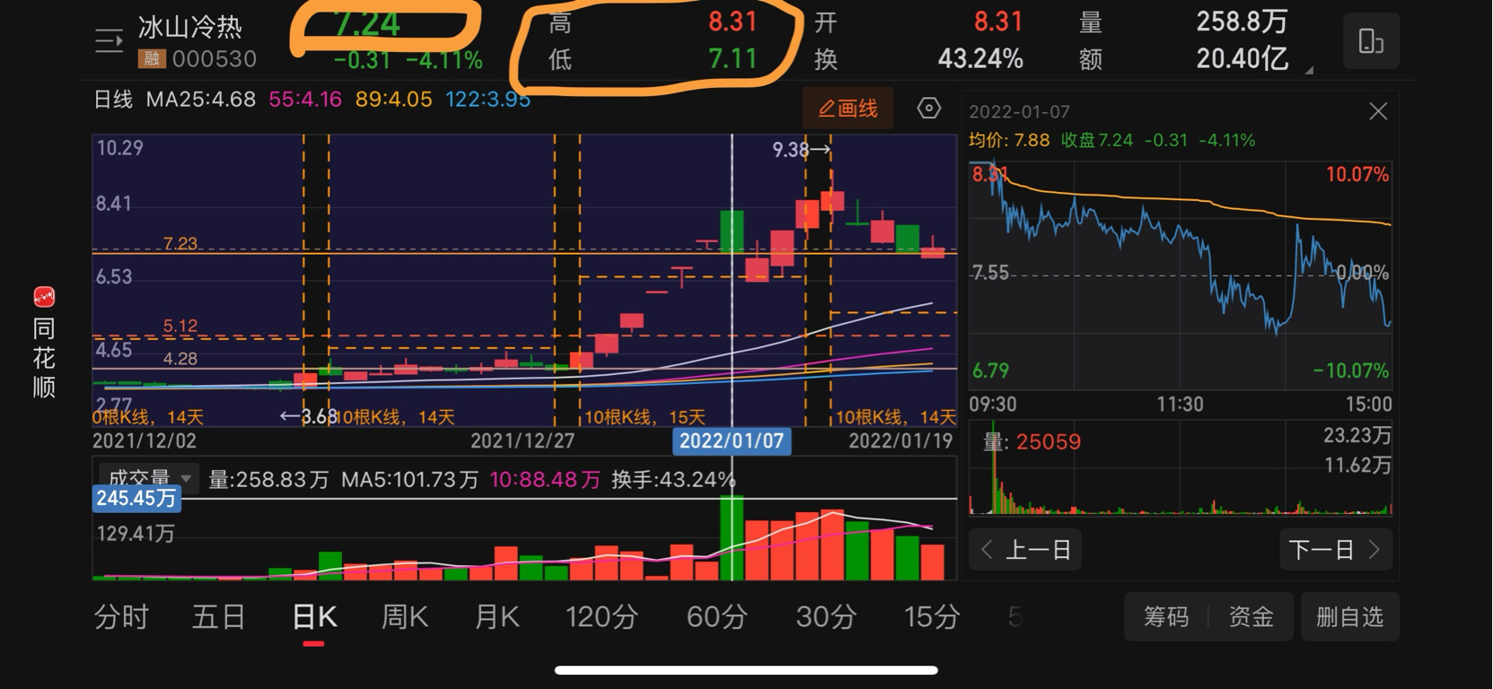 拆解一下会有两种走势,这里就说一种,概率小但最稳健的,周五拉回黄线7.8在收白7.34。周线还是长上影线。周末出利空,周一大幅低开。然后持续放量边拉边出货,做出一个新高的周阳线。然后就没有然后了。时间比是1:4左右。一个小时基本对应现在的一天。