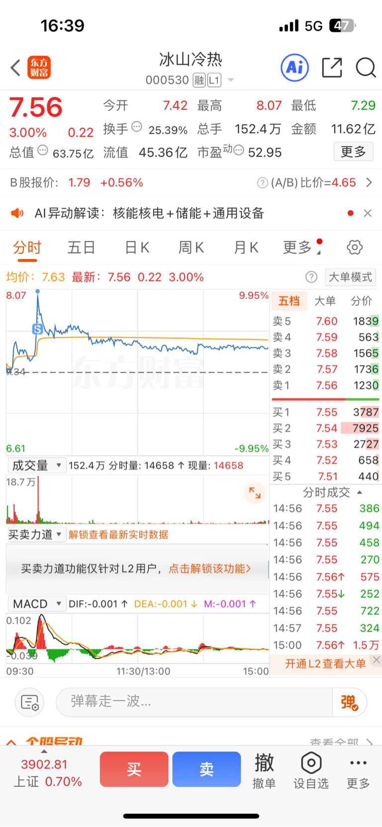 $冰山冷热(SZ000530)$ 怕到不了涨停,挂的9.5%,一股都不剩了