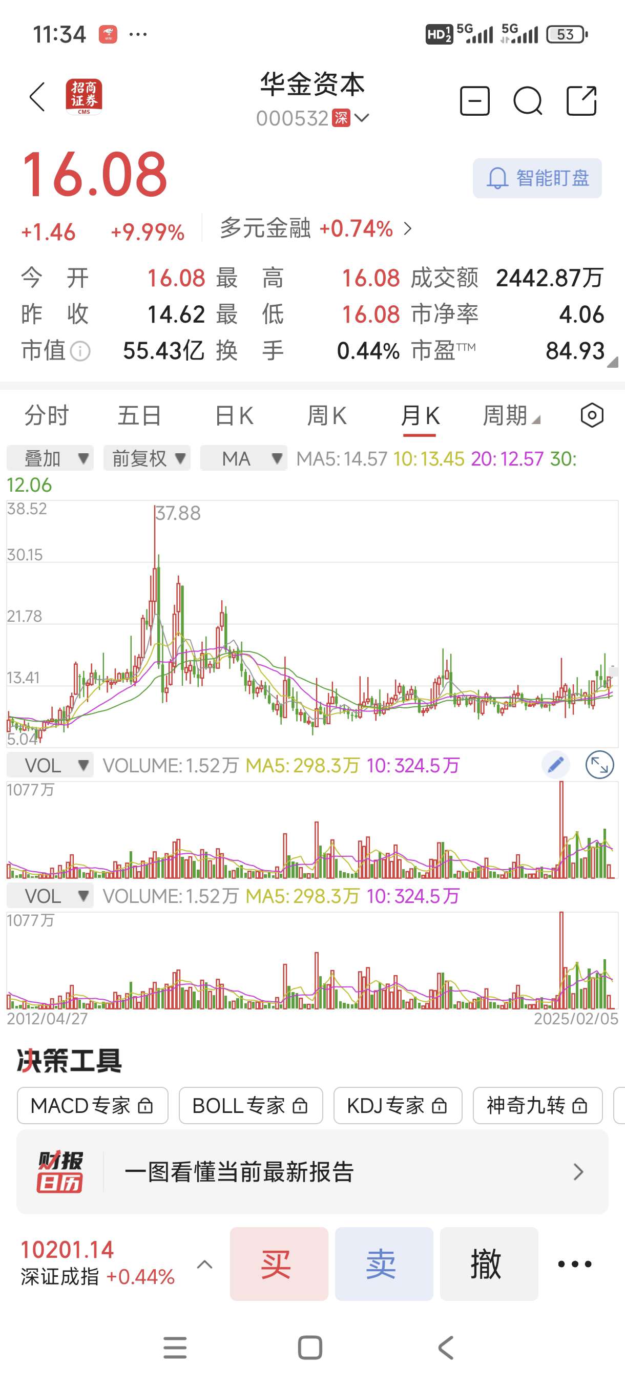 $华金资本(SZ000532)$月线看还在底部!业绩翻倍增长!根本买不入!只能望