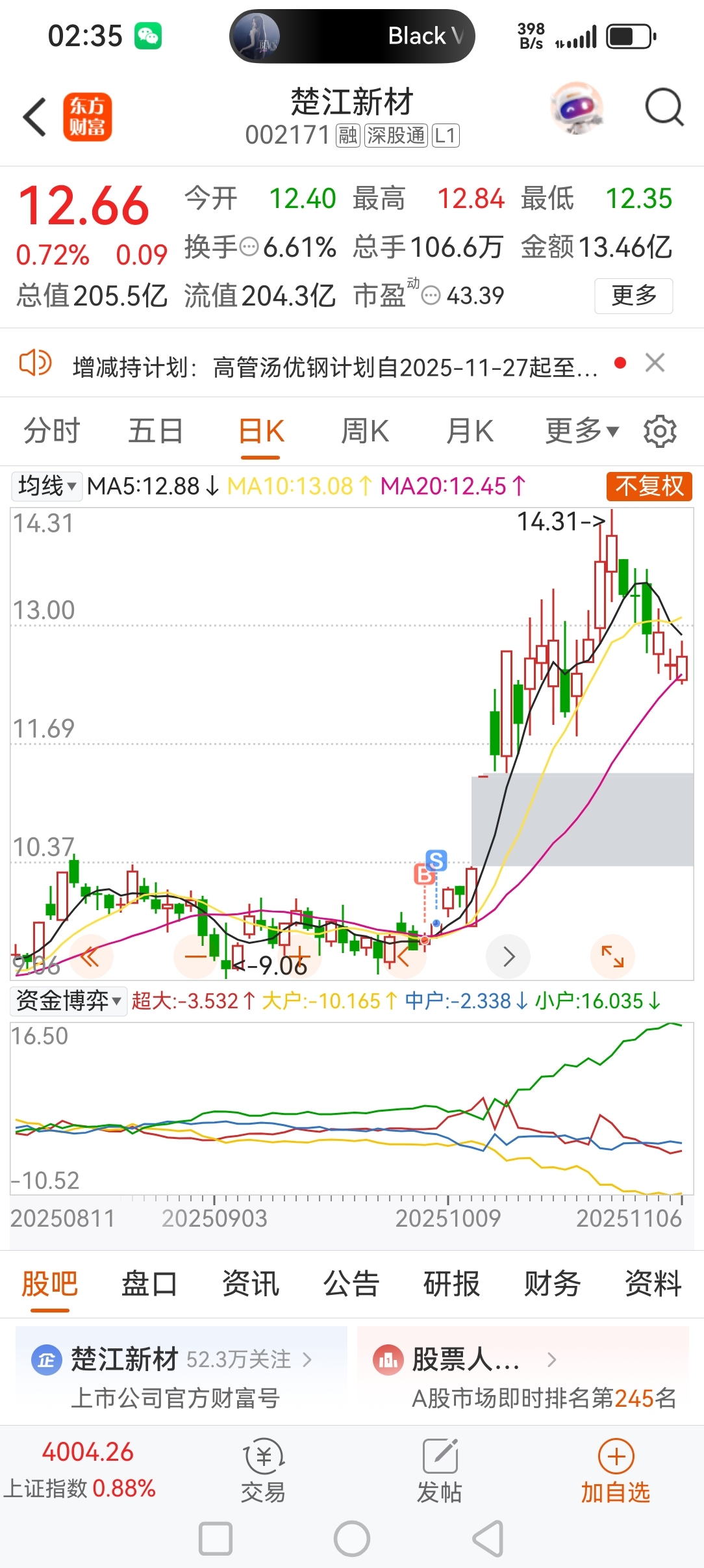3)$这叫运气前天刚岀去就涨停板,前段时间楚江新材又错过了。倒在黎明前。