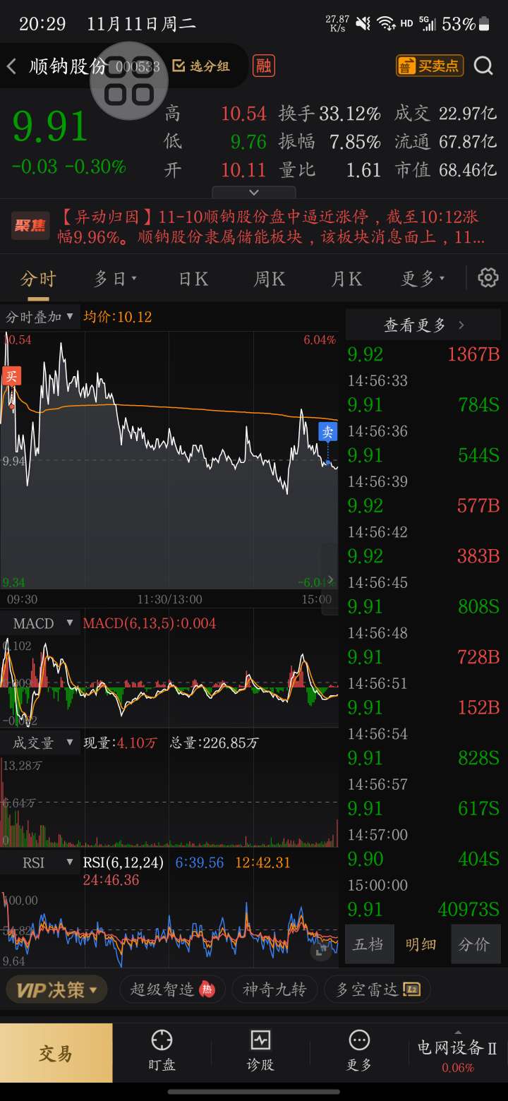 $顺钠股份(SZ000533)$ 今天这个反T做得我难受至极,尾盘含泪出完所有仓位,就留了今天进去的1600股,明天该怎么操作啊,低开是加仓还是直接走