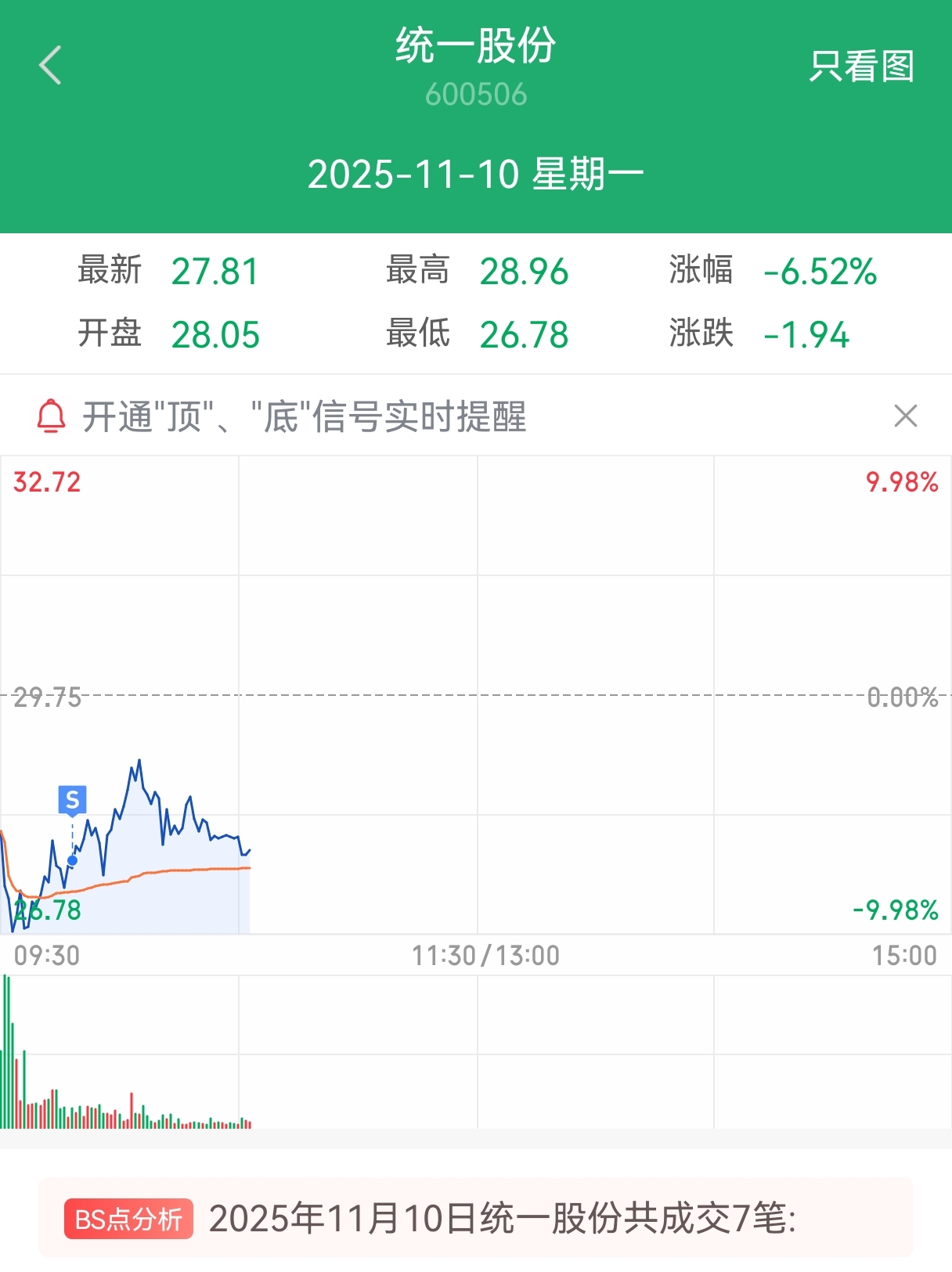 $万泽股份(SZ000534)$ $统一股份(SH600506)$ 万泽23.25止盈,统一早盘奔着跌停去了,有点吓着了,所以在反弹回落至27.5割肉了,不过割的有些早了,当时还没跌破日均线,割肉后继续反弹至28.96,28.5左右割肉更合理一些。