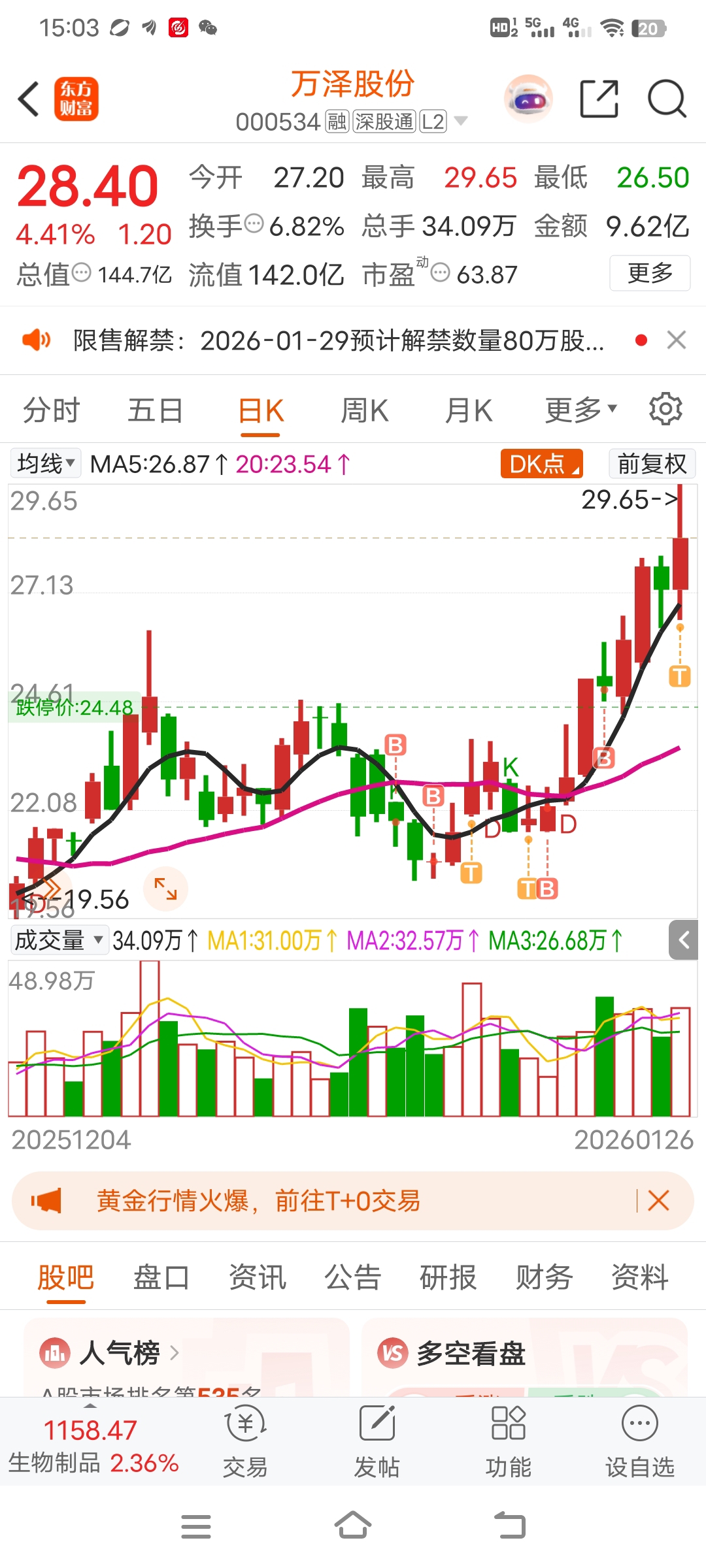 万泽今天放量滞涨,再加上明天股东减持,今天T了四个点,也减了2成仓位用来做T,应