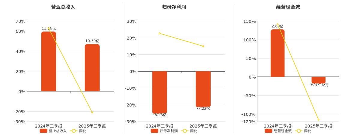 公司营业总收入为10.39亿元。归母净利润为-7.22亿元,较去年同报告期归母净利润增加1.27亿元,实现2年连续上涨。经营活动现金净流入为-3987.02万元。