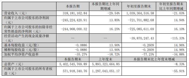 其中,第三季度公司营收为3.18亿元,同比下滑29.54%;净利润亏损2.45亿元;扣非净利润亏损2.45亿元。