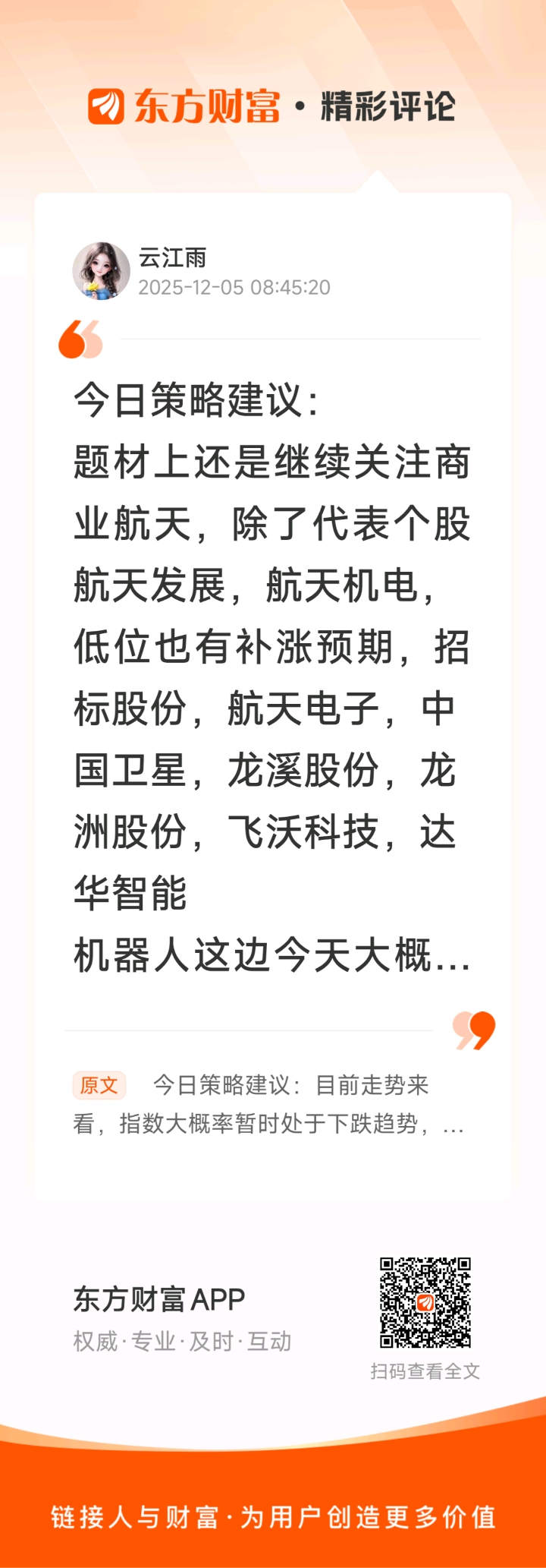 //@云江雨 :今日策略建议:题材上还是继续关注商业航天,除了代表个股航天发展,航天机电,低位也有补涨预期,招标股份,航天电子,中国卫星,龙溪股份,龙洲股份,飞沃科技,达华智能机器人这边今天大概率分化,昨天强势的个股,睿能科技,三花智控,国机重装,固高科技,恒而达,骏亚科技,华伍股份,还有人气第一的巨轮智能,看看谁能抗过分化继续晋级消费这块,海欣食品昨天爆量跌停,昨天也提示不能去追高了,剩下安记食品和重组的高乐股份目前来看消费最高板,今天预期也会分化,可以看看低位起来的,海宁皮城,群兴玩具,茂业商业也有调整到位迹象,关注今天修复机会另外摩尔线程今天上市,市场肯定会迎来吸晴资金,相关个股大众公用,初灵信息,和而泰,昨天涨停,今天如果新股大涨,看看他们的套利机会,其他低吸方向看看,圣元环保,欣贺股份,福蓉科技昨天的襄阳轴承十日线支撑,不破低吸高抛,亚钾国际五日线支撑,不破低吸高抛,其他的实盘看吧,市场持续缩量,这两天报团情绪短线出现大负反馈,亏钱效应加大,今天摩尔线程新股上市,又会极度抽血市场资金,如果不增量,难度极大,建议多看少动吧,以上个人建议,仅供参考不作为投资买卖依据!