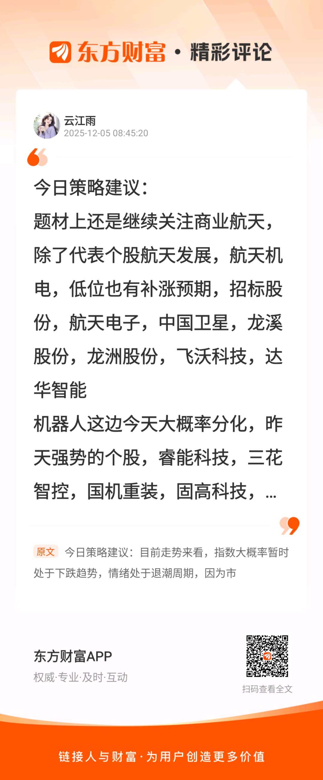 //@云江雨 :今日策略建议:题材上还是继续关注商业航天,除了代表个股航天发展,航天机电,低位也有补涨预期,招标股份,航天电子,中国卫星,龙溪股份,龙洲股份,飞沃科技,达华智能机器人这边今天大概率分化,昨天强势的个股,睿能科技,三花智控,国机重装,固高科技,恒而达,骏亚科技,华伍股份,还有人气第一的巨轮智能,看看谁能抗过分化继续晋级消费这块,海欣食品昨天爆量跌停,昨天也提示不能去追高了,剩下安记食品和重组的高乐股份目前来看消费最高板,今天预期也会分化,可以看看低位起来的,海宁皮城,群兴玩具,茂业商业也有调整到位迹象,关注今天修复机会另外摩尔线程今天上市,市场肯定会迎来吸晴资金,相关个股大众公用,初灵信息,和而泰,昨天涨停,今天如果新股大涨,看看他们的套利机会,其他低吸方向看看,圣元环保,欣贺股份,福蓉科技昨天的襄阳轴承十日线支撑,不破低吸高抛,亚钾国际五日线支撑,不破低吸高抛,其他的实盘看吧,市场持续缩量,这两天报团情绪短线出现大负反馈,亏钱效应加大,今天摩尔线程新股上市,又会极度抽血市场资金,如果不增量,难度极大,建议多看少动吧,以上个人建议,仅供参考不作为投资买卖依据!